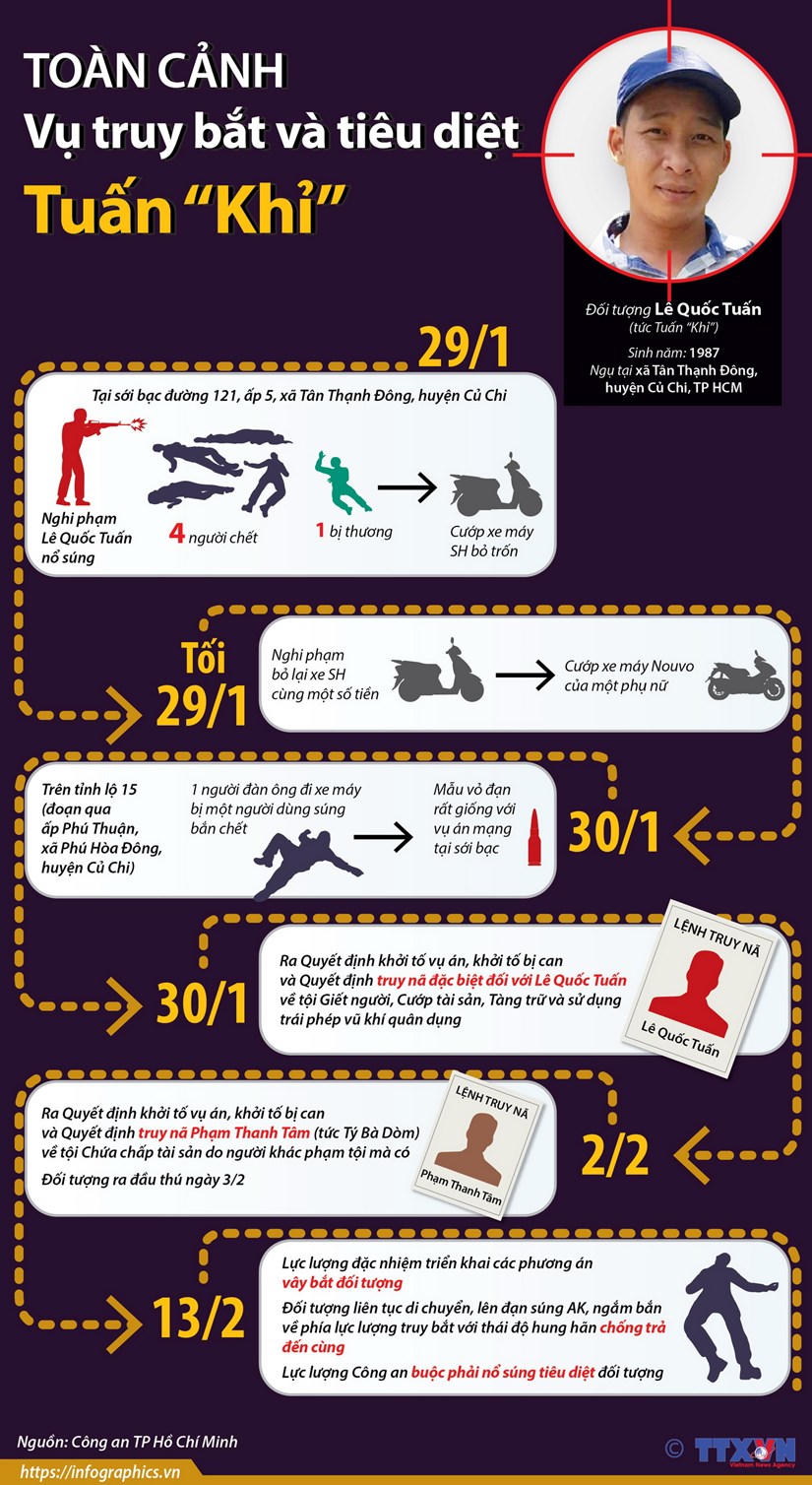 Liên quan đến vụ án giết 5 người bằng súng AK ở huyện Củ Chi, Thành phố Hồ Chí Minh, đối tượng Lê Quốc Tuấn (tức Tuấn Khỉ), sinh năm 1987, trú ở huyện Củ Chi - nghi can chính của vụ án, đã bị tiêu diệt trong quá trình vây bắt vào tối 13/2./.