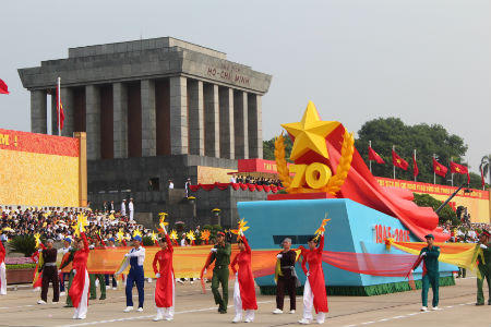 Hôm nay, Đảng, Nhà nước, Mặt trận Tổ quốc Việt Nam tổ chức trọng thể Lễ kỷ niệm 70 năm Cách mạng tháng Tám và Quốc khánh nước Cộng hòa xã hội chủ nghĩa Việt Nam. Trong niềm tự hào và xúc động thiêng liêng, chúng ta thành kính tưởng nhớ Chủ tịch Hồ Chí Minh, vị lãnh tụ thiên tài, Anh hùng giải phóng dân tộc, danh nhân văn hóa thế giới, Người đã cống hiến cả cuộc đời cho dân, cho nước, dẫn dắt Đảng ta, nhân dân ta làm nên những thắng lợi vẻ vang, làm rạng rỡ dân tộc ta, non sông đất nước ta. Tư tưởng và sự nghiệp của Người là tài sản vô giá, ngọn đuốc soi đường cho dân tộc ta vững bước đi tới tương lai.