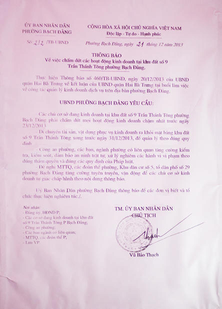 Chiều qua, trước cổng vào khu Zone 9, UBND phường Bạch Đằng có dán thông báo về việc chấm dứt mọi hoạt động tại Zone 9. Trong bản thông báo ghi rõ: "Các chủ sở hữu kinh doanh tại khu đất số 9 đường Trần Thánh Tông phường Bạch Đằng phải chấm dứt hoạt động kinh doanh chậm nhất trước ngày 23/12/2013.