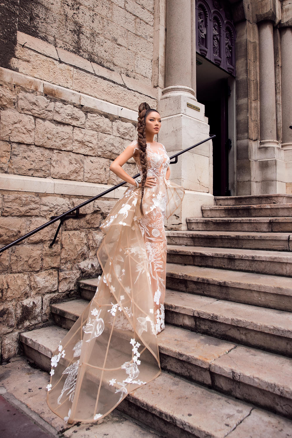 Điểm nhấn của set nữ trang là chú báo ngạo nghễ, uy quyền ngự trị trên cổ tay của người đẹp. Ngoài ra makeup Minh Lộc cũng khéo léo chọn kiểu thắt bím với hình ảnh Mẹ rồng trong Trò chơi vương quyền, nhắằ tạo phong thái nữ vương cho Lý Nhã Kỳ. Ở lần sải bước này, trang phục có thêm phần peplum sáng tạo thành áo choàng phía sau quét thảm đỏ, giúp người đẹp không khác gì bà hoàng đêm hội.