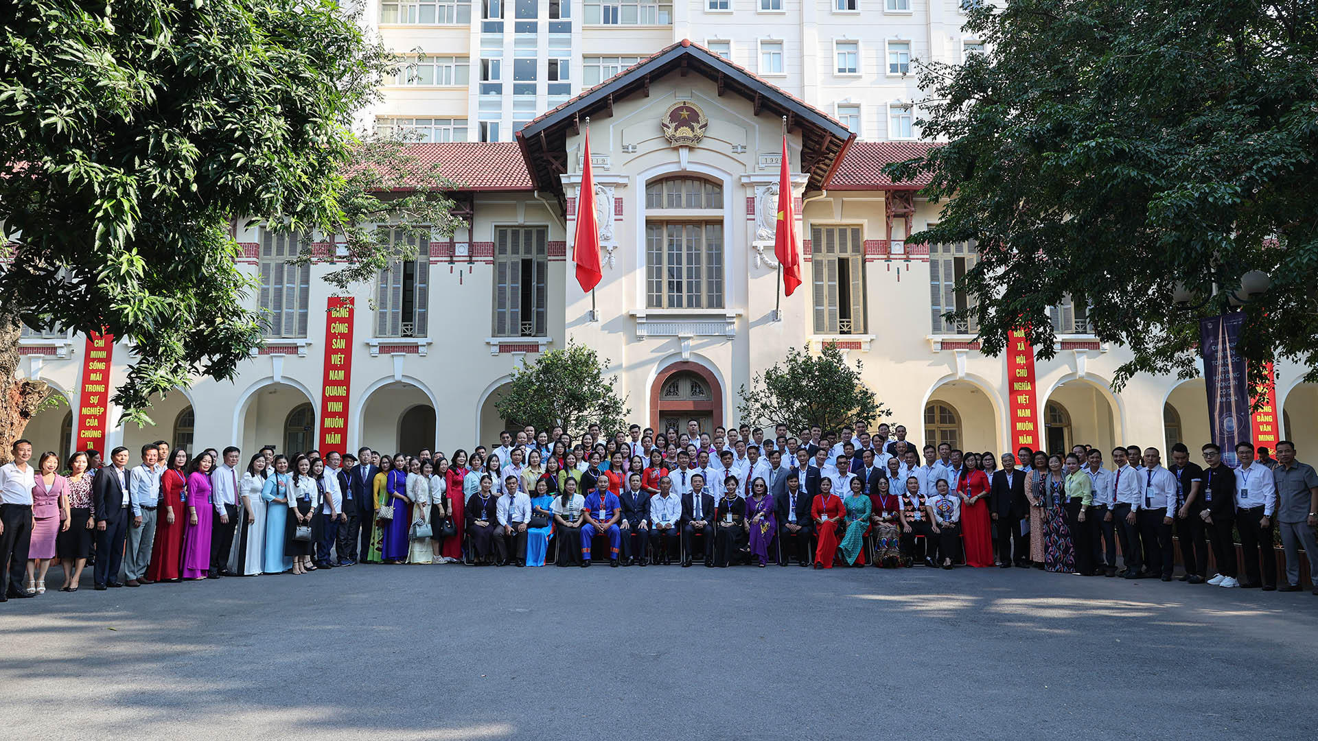 Các đại biểu dự Hội nghị chụp ảnh lưu niệm tại trụ sở Bộ Thông tin và Truyền thông. (Ảnh: T.A) |
