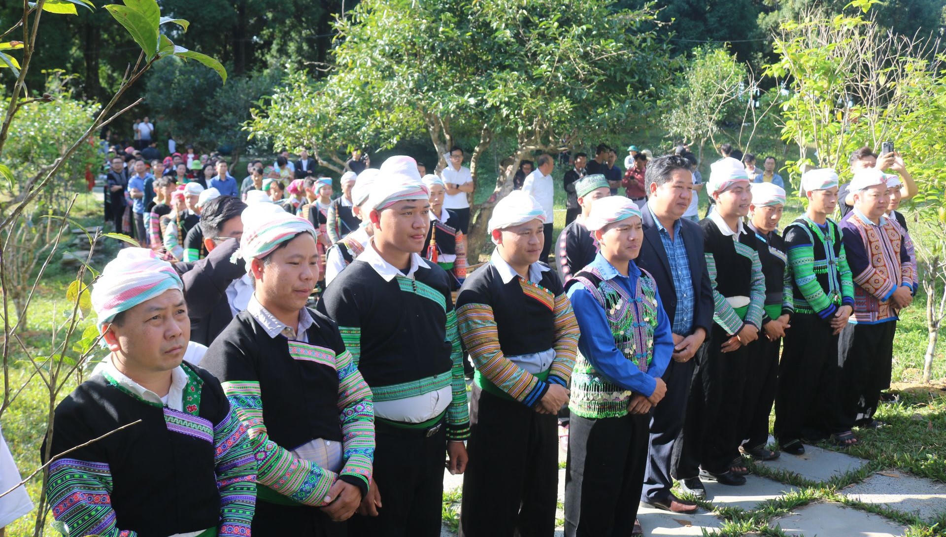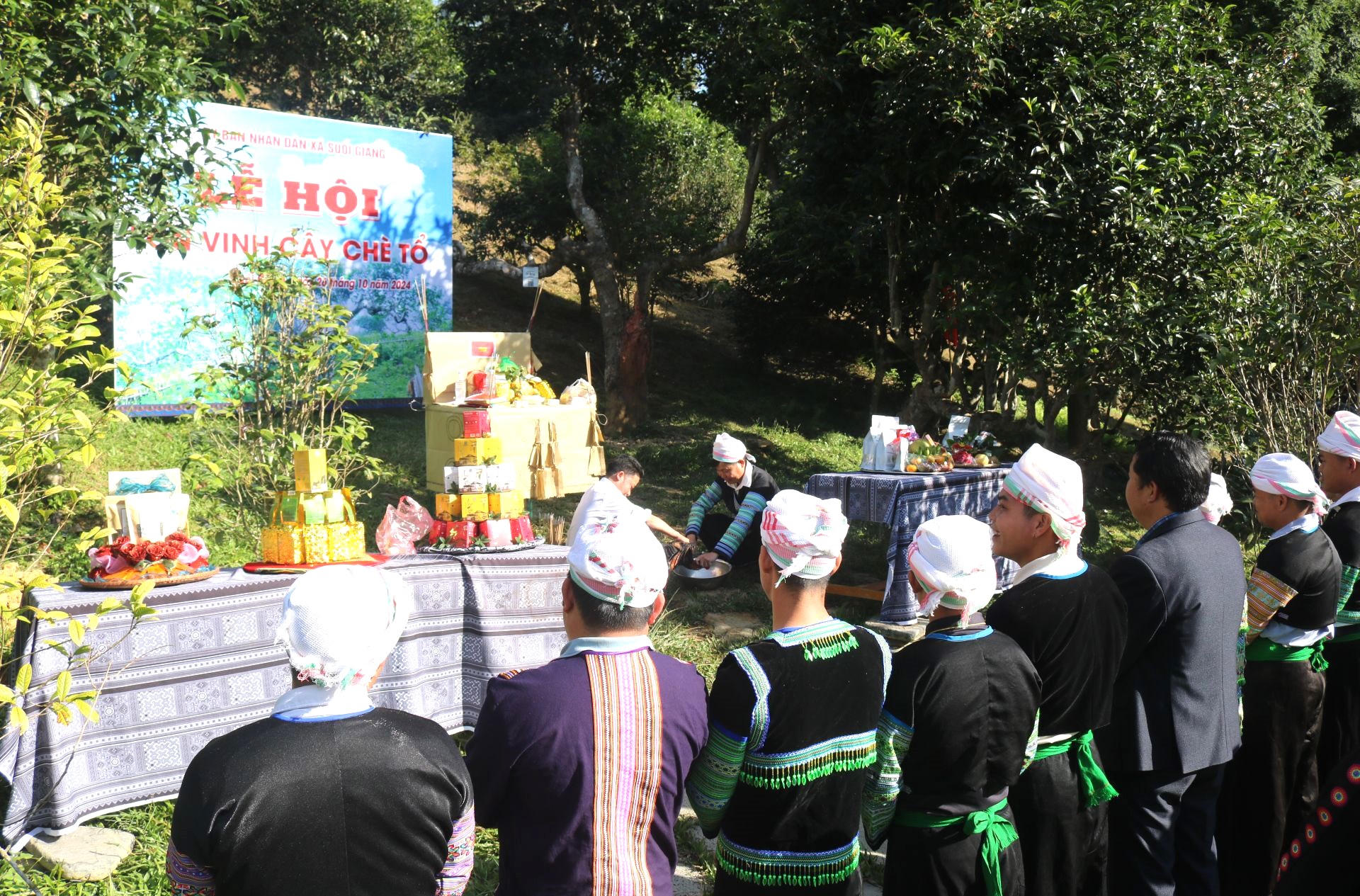 Theo ông Giàng, lễ tôn vinh cây trà tổ hơn 400 tuổi được thực hiện lúc 8h hôm nay nhưng công tác chuẩn bị đã được thực hiện từ sáng sớm. Mở đầu Lễ hội là hoạt động rước lễ từ trụ sở UBND xã Suối Giàng đến địa điểm cây chè tổ.