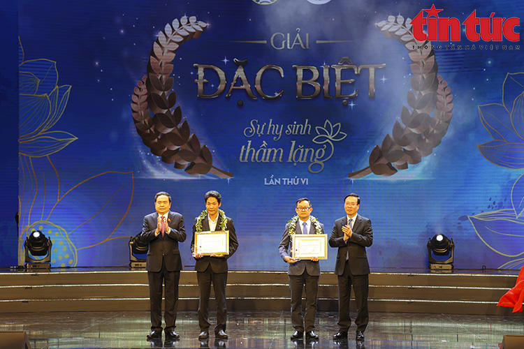 Đồng chí Võ Văn Thưởng, Ủy viên Bộ Chính trị, Chủ tịch nước CHXHCN Việt Nam; Đồng chí Trần Thanh Mẫn, Ủy viên Bộ Chính trị, Phó Chủ tịch Thường trực Quốc hội nước CHXHCN Việt Nam trao giải Đặc biệt cho tác giả Ngô Anh Văn và trao chứng nhận cho nhân vật trong tác phẩm đoạt giải - Bác sĩ Võ Thái Trung.