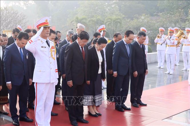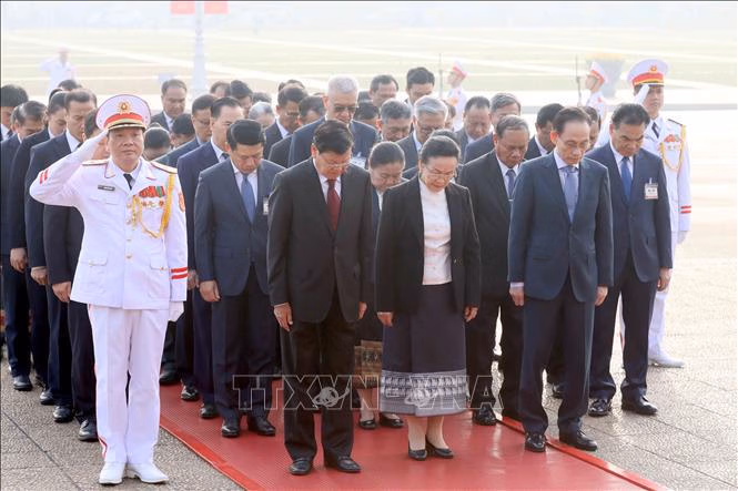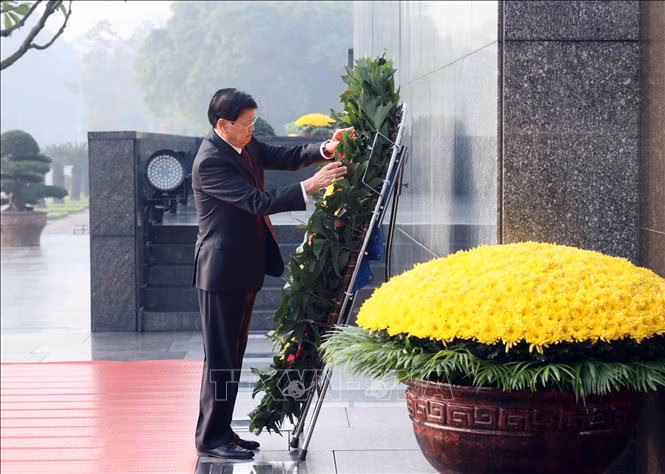 Tổng Bí thư, Chủ tịch nước Lào Thongloun Sisoulith và Phu nhân cùng Đoàn đại biểu cấp cao Đảng, Nhà nước Lào đã đặt vòng hoa tưởng nhớ Chủ tịch Hồ Chí Minh, Anh hùng giải phóng dân tộc, Nhà văn hóa kiệt xuất của Việt Nam.