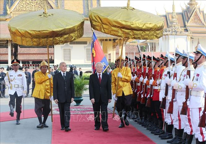 | Quốc vương Campuchia Norodom Sihamoni đón Tổng Bí thư, Chủ tịch nước Nguyễn Phú Trọng. Ảnh TTXVN |