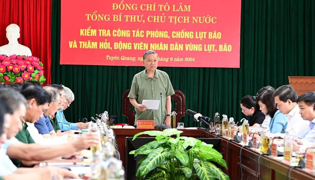 Phát biểu tại buổi làm việc, Tổng Bí thư, Chủ tịch nước Tô Lâm bày tỏ sự cảm thông và chia sẻ sâu sắc nhất đối với những thiệt hại mà người dân Tuyên Quang cũng như các tỉnh phía Bắc đang phải gánh chịu do hoàn lưu bão số 3 gây ra. Tổng Bí thư đánh giá cao tỉnh Tuyên Quang đã chủ động, nắm chắc tình hình, kịp thời có những chỉ đạo, thực hiện các biện pháp phòng, chống, khắc phục hậu quả cơn bão số 3 theo đúng tinh thần chỉ đạo chung của Bộ Chính trị của Chính phủ.