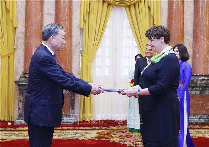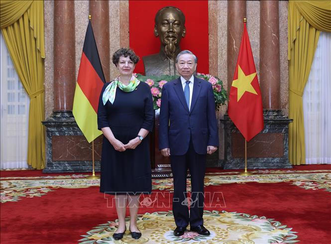 Tổng Bí thư, Chủ tịch nước Tô Lâm nhận Quốc thư từ Đại sứ Cộng hoà Liên bang Đức tại Việt Nam Helga Margarete Barth. Ảnh: Lâm Khánh/TTXVN