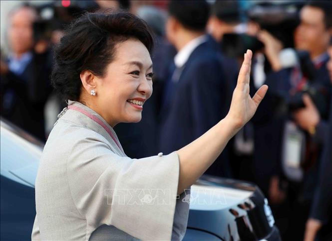 Giáo sư Bành Lệ Viên, Phu nhân Tổng Bí thư, Chủ tịch nước Trung Quốc Tập Cận Bình vẫy chào các đại biểu ra tiễn tại sân bay quốc tế Nội Bài. |