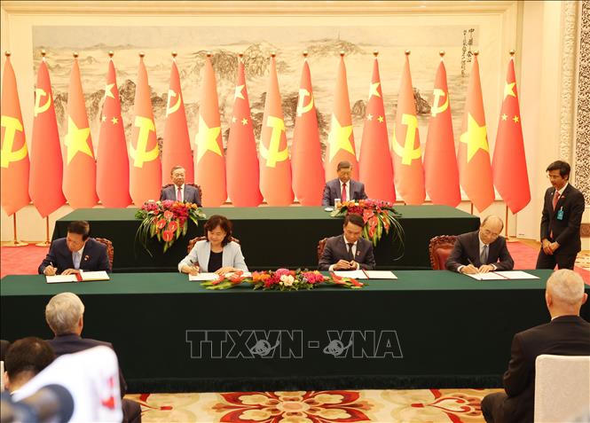 Tổng Bí thư, Chủ tịch nước Tô Lâm và Tổng Bí thư, Chủ tịch nước Trung Quốc Tập Cận Bình chứng kiến Lễ ký các văn kiện hợp tác giữa hai nước. Ảnh: Trí Dũng/TTXVN |