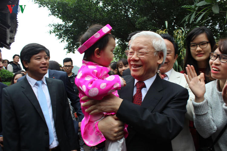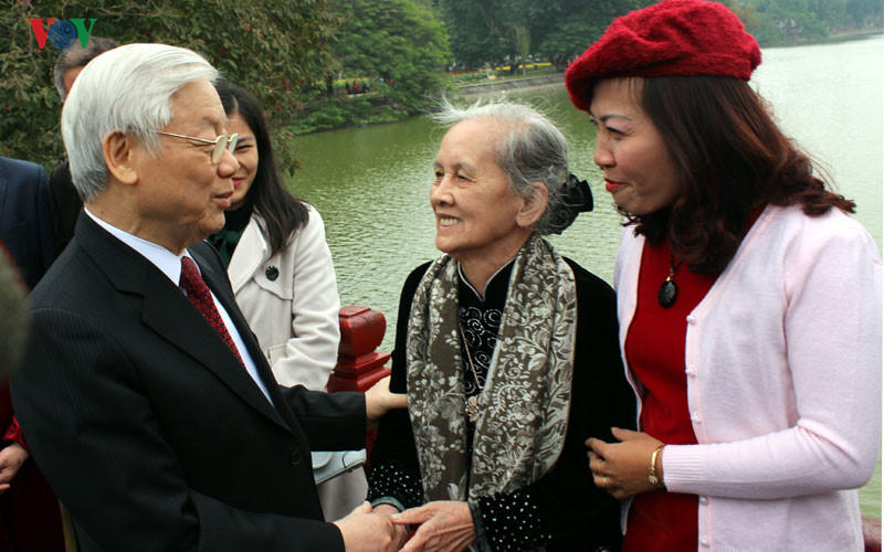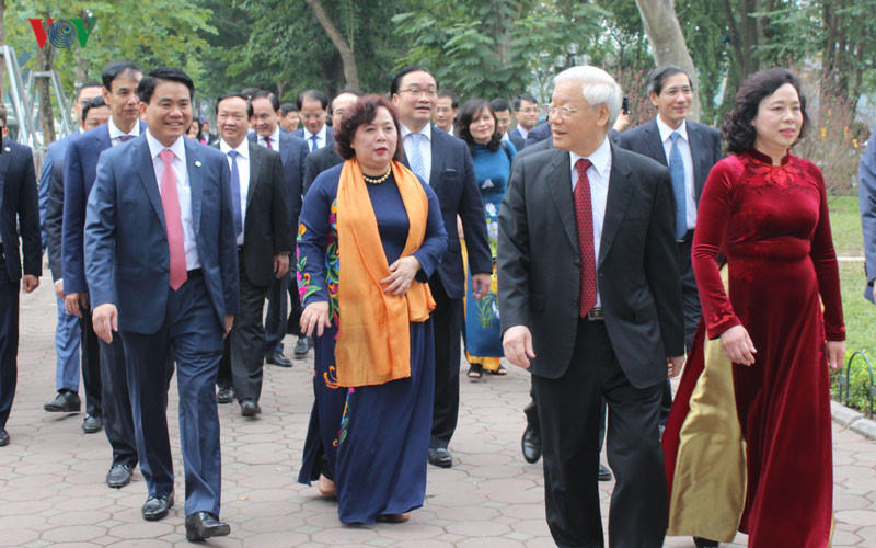 Sáng đầu năm, Tổng Bí thư Nguyễn Phú Trọng dâng hương trước Tượng đài Vua Lý Thái Tổ, Đền Ngọc Sơn và Tượng đài Vua Lê Thái Tổ, sau đó thư thái dạo bộ bên bờ Hồ Gươm, thăm hỏi, chúc Tết người dân và du khách, nựng nịu, mừng tuổi trẻ nhỏ...