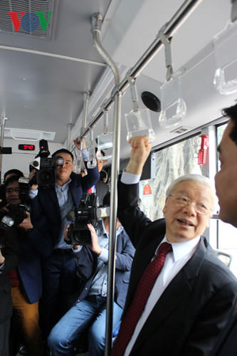 Tổng Bí thư còn trải nghiệm xe buýt chất lượng cao của Thủ đô.