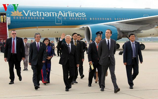 Vào lúc 8h25’ ngày 6/7 (theo giờ Hoa Kỳ) - tức 19h25’ theo giờ Việt Nam, Tổng Bí thư Nguyễn Phú Trọng đã tới thủ đô Washington, bắt đầu chuyến thăm chính thức Hợp chúng quốc Hoa Kỳ theo lời mời của chính quyền Tổng thống Barack Obama.