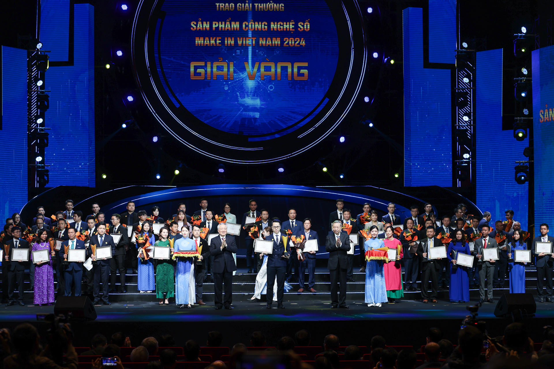Tổng Bí thư Tô Lâm và Phó Thủ tướng Thường trực Nguyễn Hoà Bình trao Giải vàng cho các sản phẩm công nghệ số Make in Viet Nam 2024. (Ảnh: T.Anh) |