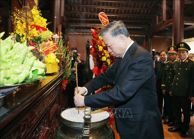 Tổng Bí thư Tô Lâm và đoàn công tác dâng hoa, dâng hương tại Đền Chung Sơn - Đền thờ gia tiên Chủ tịch Hồ Chí Minh. Ảnh: Thống Nhất/TTXVN