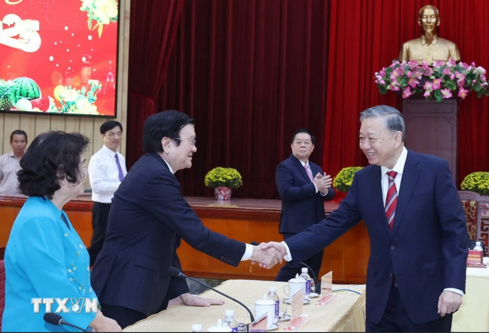 Sáng 9/1, tại TP HCM, nhân dịp chuẩn bị đón tết Nguyên đán cổ truyền Ất Tỵ 2025, hướng tới 95 năm Ngày thành lập Đảng Cộng sản Việt Nam (3/2/1930-3/2/2025), Tổng Bí thư Tô Lâm đã có buổi gặp mặt các đồng chí nguyên lãnh đạo Đảng, Nhà nước, cán bộ lão thành tiêu biểu và đại biểu trí thức, nhà khoa học, văn nghệ sĩ các tỉnh, thành phía Nam.