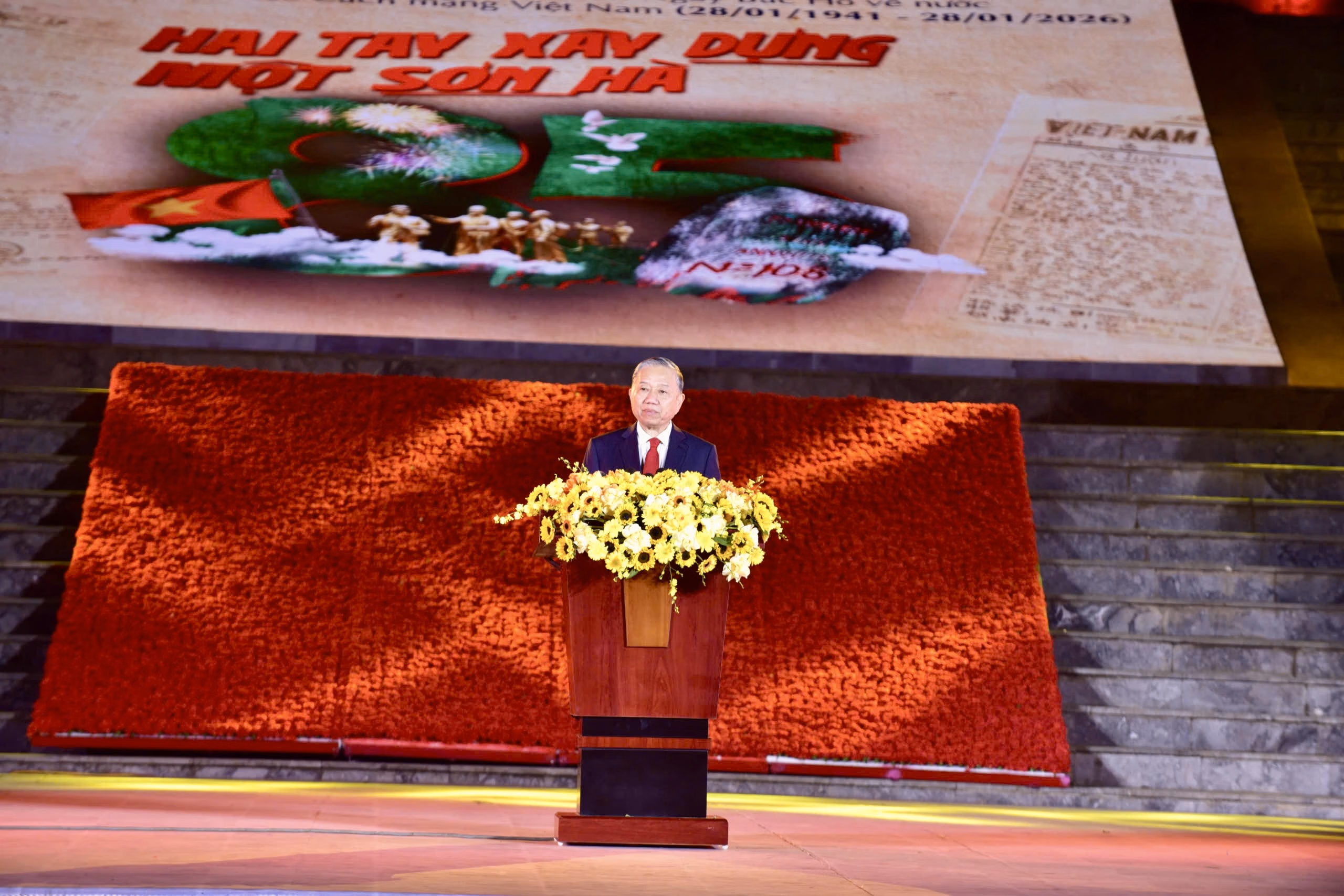 Tổng Bí thư cho rằng, vùng cội nguồn cách mạng, trước hết là Cao Bằng, giữ vị trí đặc biệt quan trọng, vừa là nơi khởi nguồn của cách mạng Việt Nam, vừa là vùng biên cương, phên dậu của Tổ quốc. Chăm lo cho vùng cội nguồn cách mạng, cho đồng bào các dân tộc thiểu số, cho vùng biên giới không chỉ là chính sách xã hội, mà là đầu tư cho nền tảng an ninh, cho tương lai dài hạn của quốc gia. Trước anh linh Chủ tịch Hồ Chí Minh kính yêu, chúng ta nguyện đoàn kết một lòng, kiên định con đường đã lựa chọn; kế thừa xứng đáng di sản mà Người để lại; hành động quyết liệt, làm việc hiệu quả, mỗi cấp, mỗi ngành, mỗi cán bộ, đảng viên nêu cao trách nhiệm trước nhân dân, quyết tâm xây dựng một nước Việt Nam hòa bình, độc lập, tự chủ, hùng cường và thịnh vượng, đóng góp tích cực cho hòa bình và phát triển của khu vực và thế giới.
