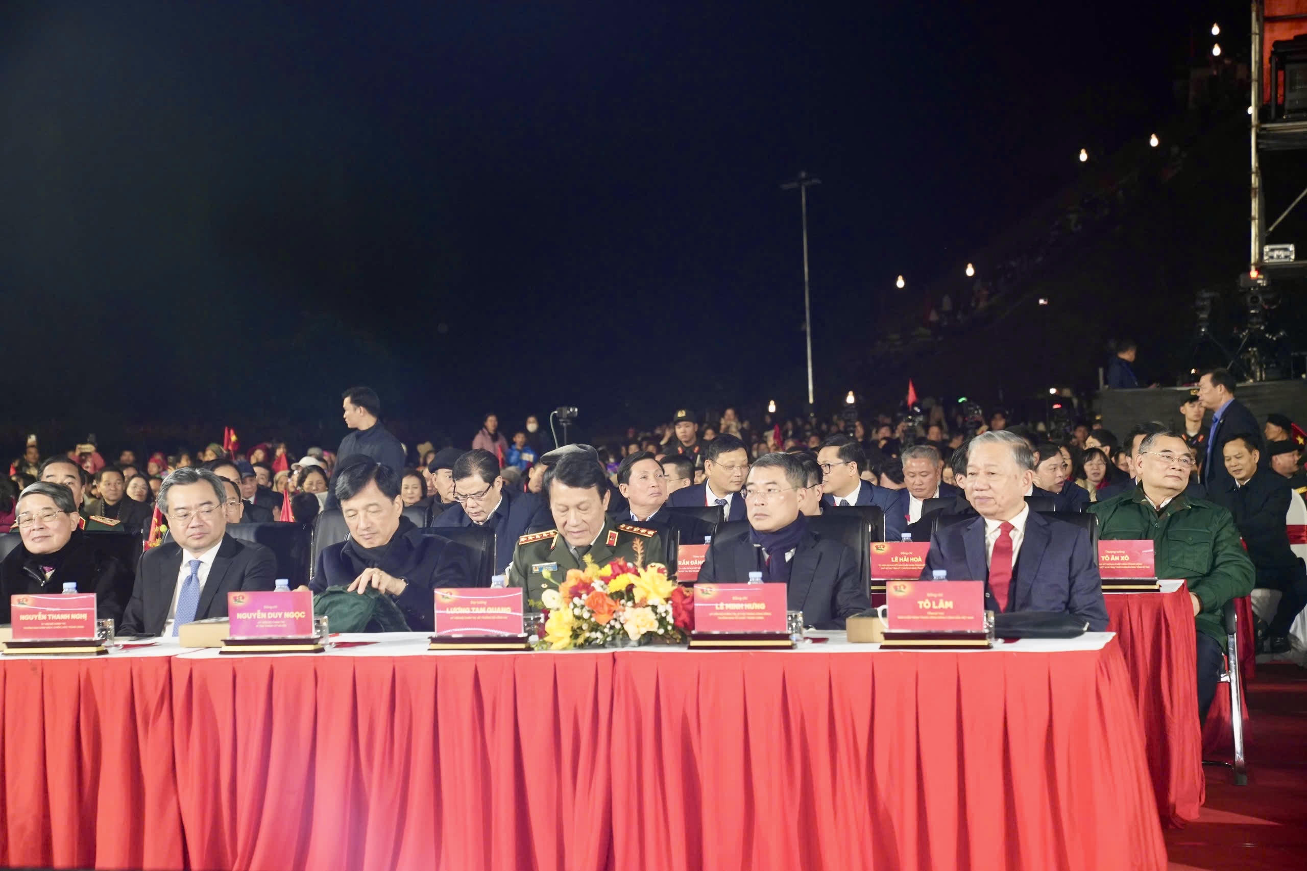 Tham dự tại điểm cầu Khu di tích Quốc gia đặc biệt Pác Bó, xã Trường Hà, tỉnh Cao Bằng có: Tổng Bí thư Tô Lâm; nguyên Tổng Bí thư Nông Đức Mạnh; các đồng chí nguyên Thường trực Ban Bí thư: Phan Diễn, Trần Quốc Vượng.