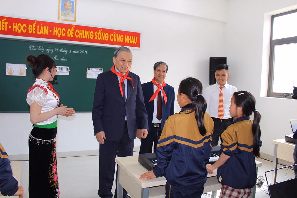 Tổng Bí thư mong muốn các học sinh trân trọng điều kiện học tập đã có, chăm ngoan, nỗ lực học tập, rèn luyện ý chí, nuôi dưỡng ước mơ, hoài bão, để sau này góp phần xây dựng quê hương, đất nước. Các thầy cô giáo tiếp tục đoàn kết, trách nhiệm, tận tâm với nghề, coi học sinh như con em của mình, để ngôi trường này thực sự trở thành nơi ươm mầm tri thức, nuôi dưỡng nhân cách, chắp cánh tương lai cho các thế hệ học sinh nơi biên cương Tổ quốc.
