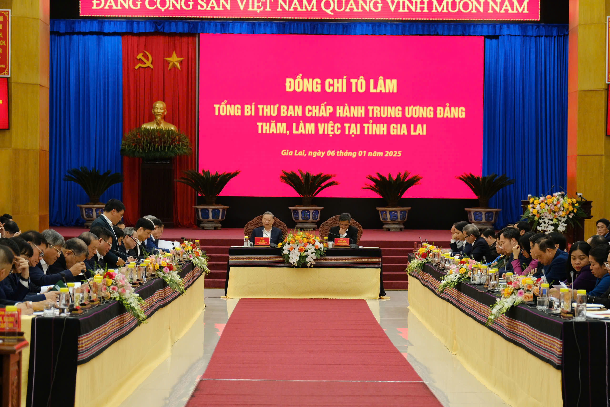 Phát biểu tại buổi làm việc, Tổng Bí thư Tô Lâm ghi nhận và biểu dương những kết quả tỉnh Gia Lai đạt được trong thời gian qua. Để Gia Lai trở thành tỉnh khá của khu vực Duyên hải Miền Trung-Tây Nguyên, trù phú về nông nghiệp hữu cơ, đa dạng về sinh thái, phong phú, đặc sắc về vốn văn hóa, bền vững về mặt xã hội và môi trường, đẩy nhanh tốc độ phát triển và nâng cao chất lượng cuộc sống người dân, Tổng Bí thư Tô Lâm lưu ý một số giải pháp trọng tâm. Trong đó, Gia Lai cần rà soát các chỉ tiêu, nhiệm vụ, giải pháp cụ thể, tháo gỡ những ách tắc và điểm nghẽn phát triển, phấn đấu thực hiện ở mức cao nhất các mục tiêu, nhiệm vụ mà Nghị quyết đại hội Đảng bộ tỉnh lần thứ XVI đã đề ra.