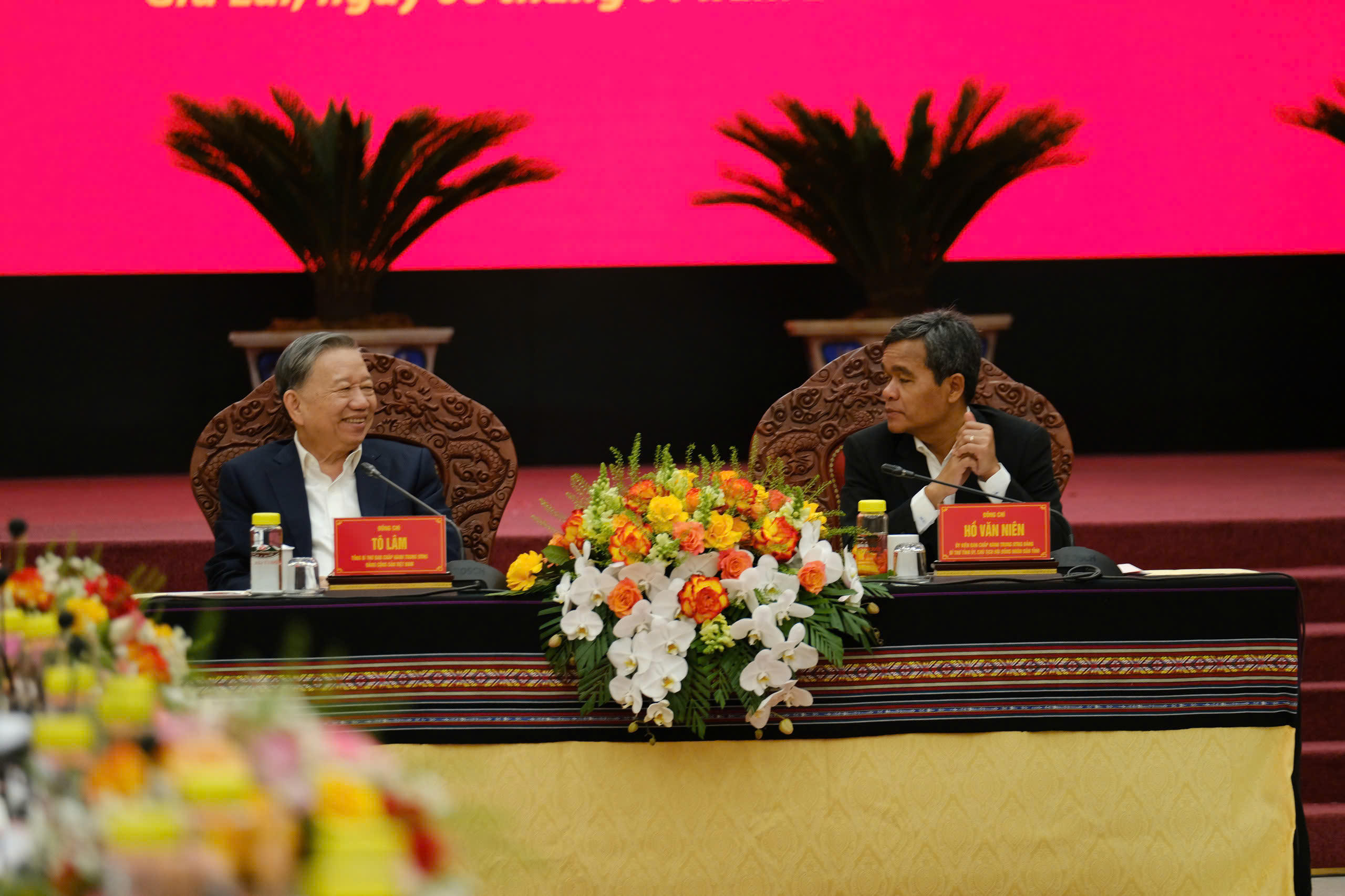 Tổng Bí thư Tô Lâm và Bí thư Tỉnh ủy Gia Lai Hồ Văn Niên tại buổi làm việc. Ảnh: Tấn Lực |