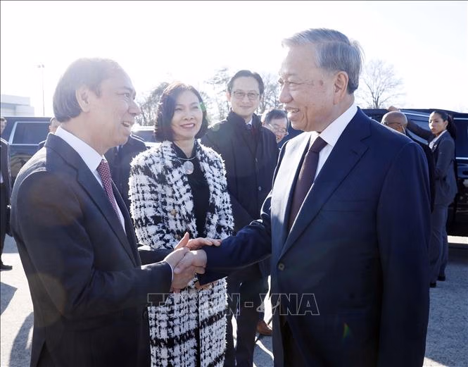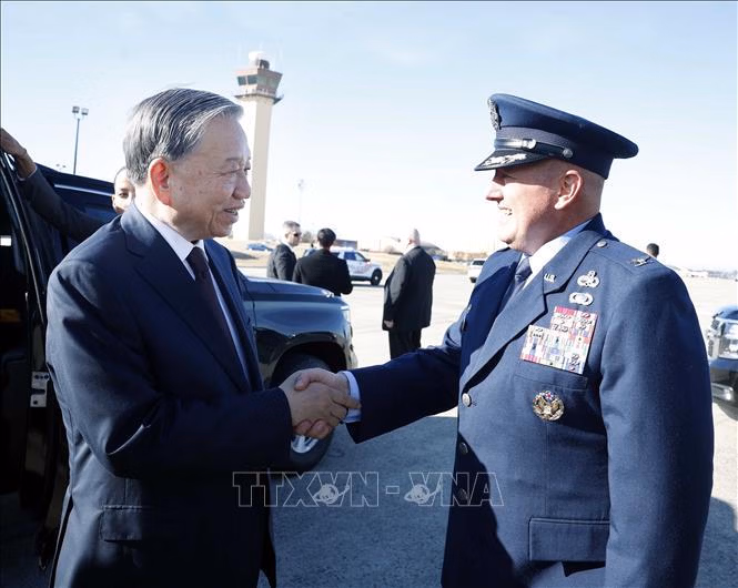 Tiễn Tổng Bí thư Tô Lâm và đoàn tại sân bay quân sự Andrews có: Đại sứ Việt Nam tại Hoa Kỳ Nguyễn Quốc Dũng; Đại sứ, Trưởng phái đoàn Việt Nam tại Liên hợp quốc (LHQ) Đỗ Hùng Việt; Tổng Lãnh sự Việt Nam tại San Francisco Hoàng Anh Tuấn; Tổng Lãnh sự Việt Nam tại Houston Hoàng Thùy Dương; cùng các cán bộ, nhân viên Đại sứ quán.