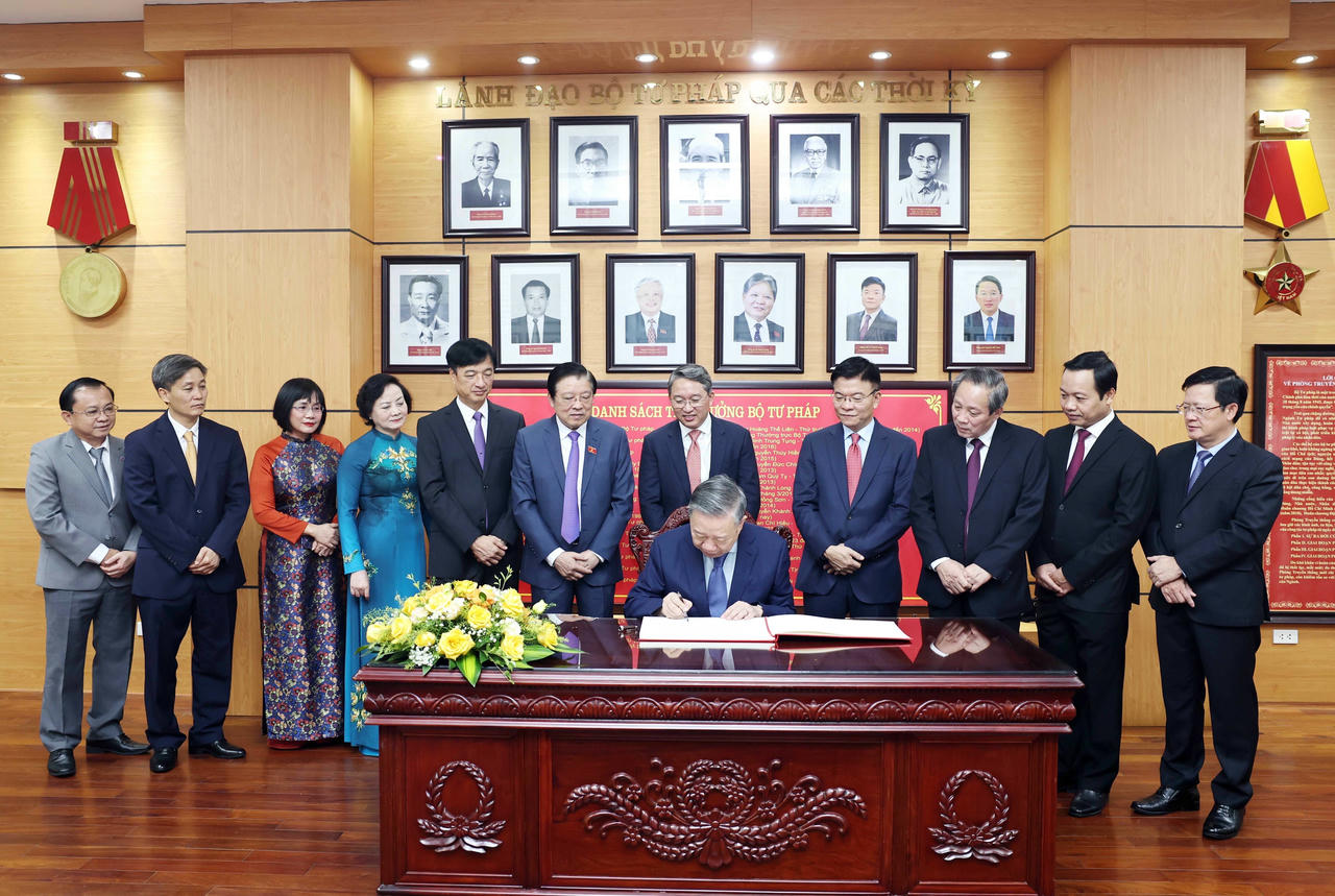 Tổng Bí thư Tô Lâm ghi lưu bút tại Phòng Truyền thống Bộ Tư pháp. Ảnh TTXVN |