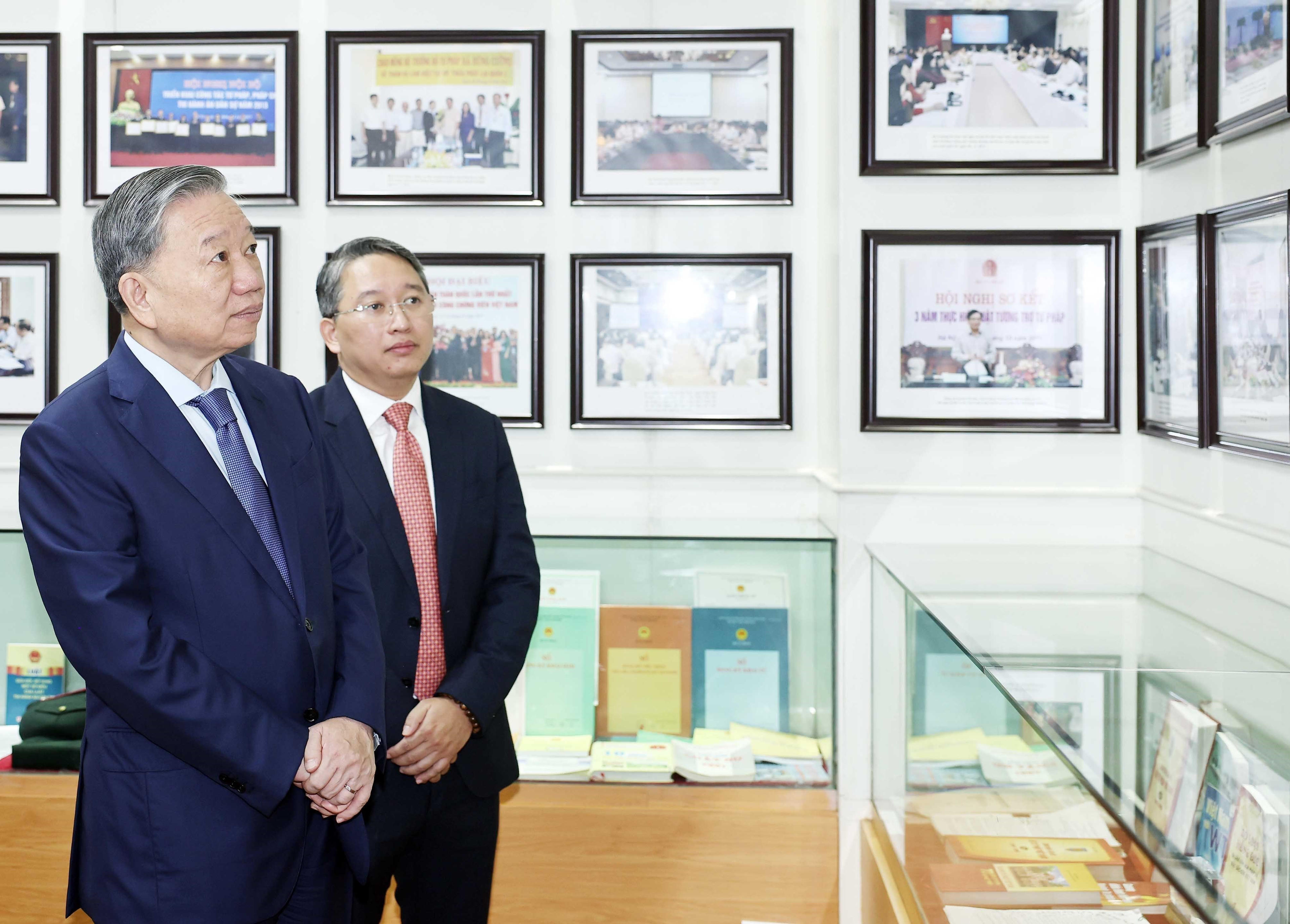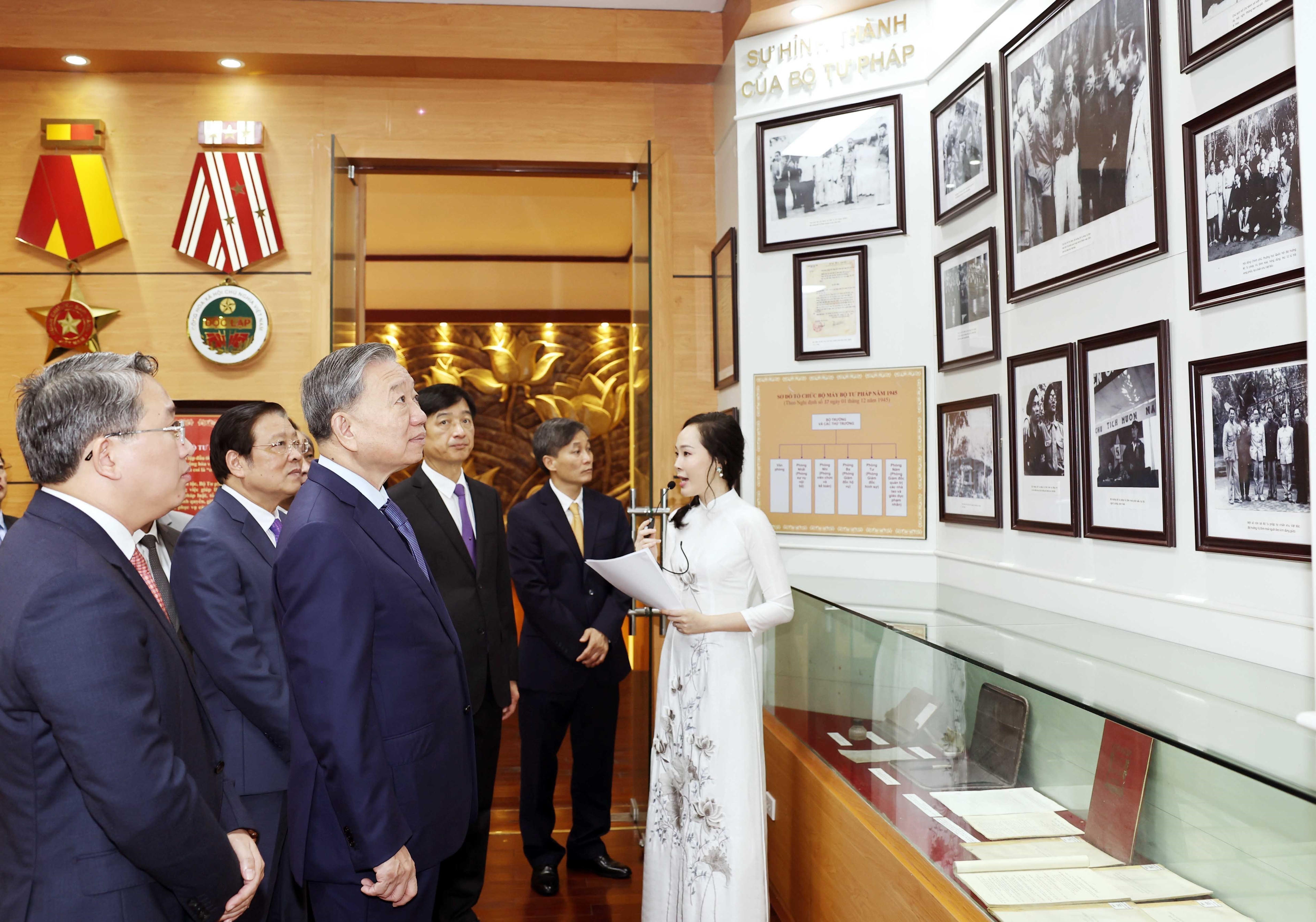 | Tổng Bí thư Tô Lâm thăm Phòng Truyền thống Bộ Tư pháp. Ảnh TTXVN |
