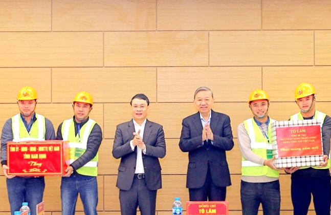 Tổng Bí thư Tô Lâm tới thăm và tặng quà cho cán bộ, nhân viên đang làm việc tại Dự án xây dựng Bệnh viện Đa khoa tỉnh Nam Định. |
