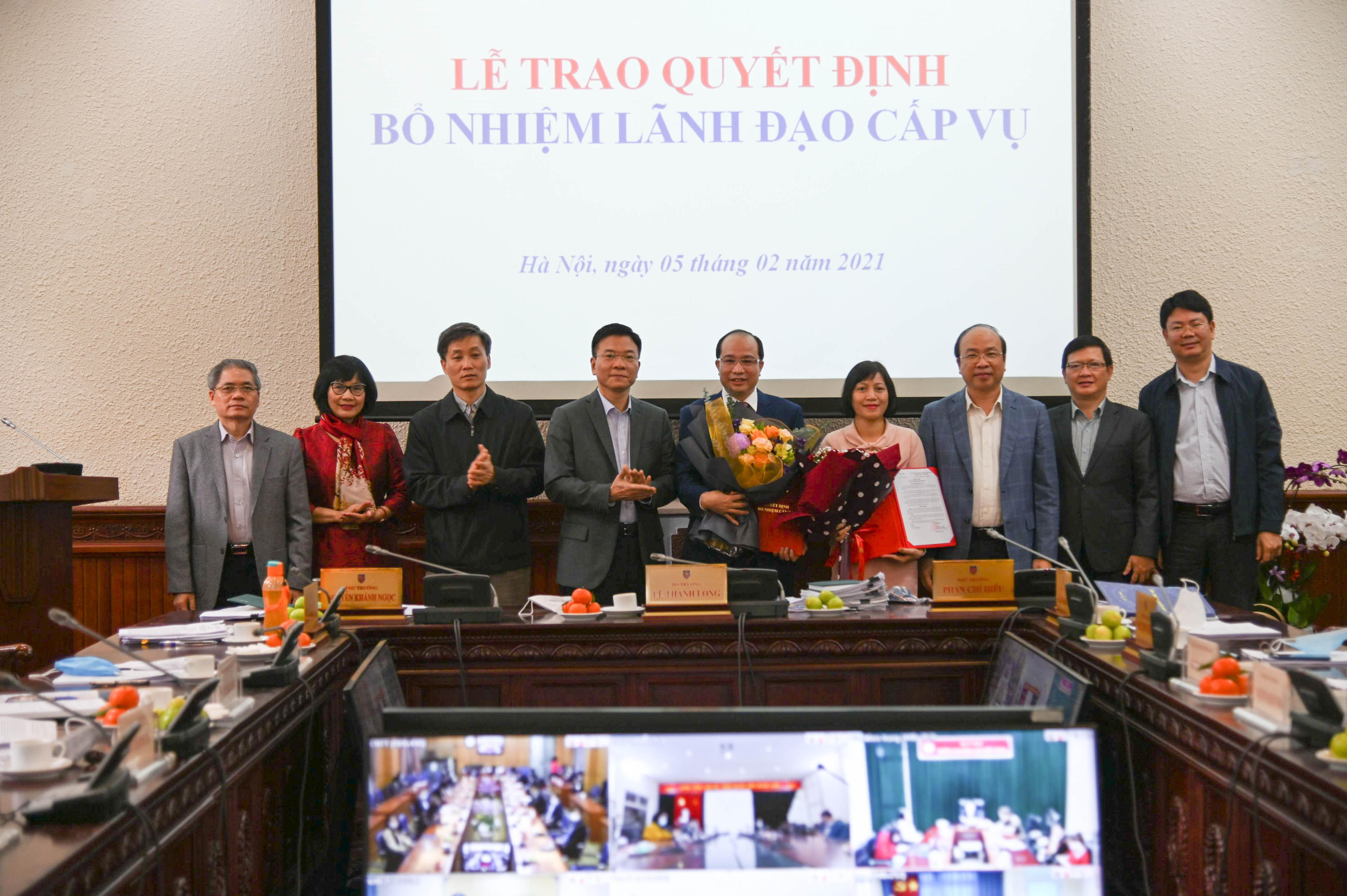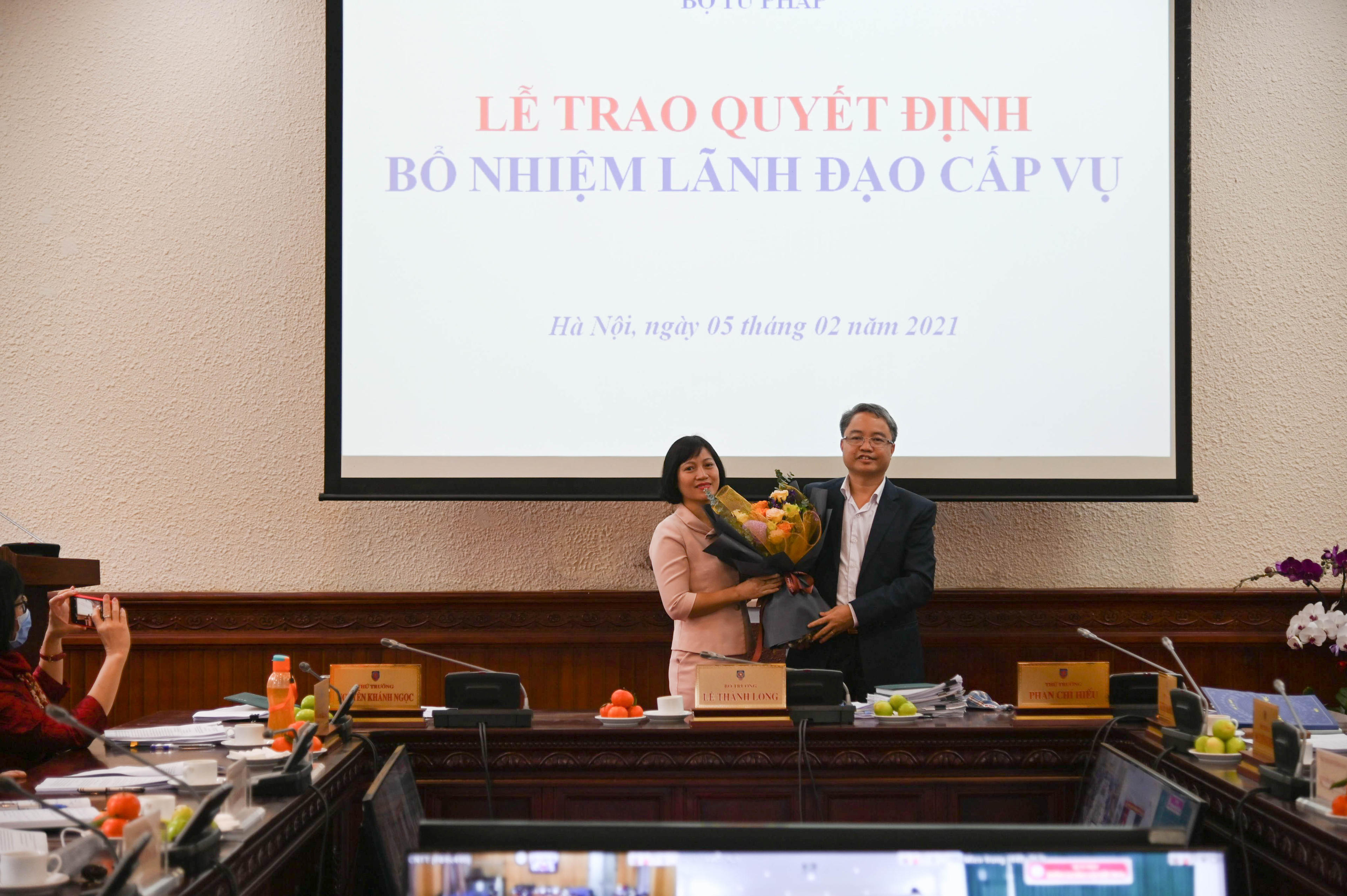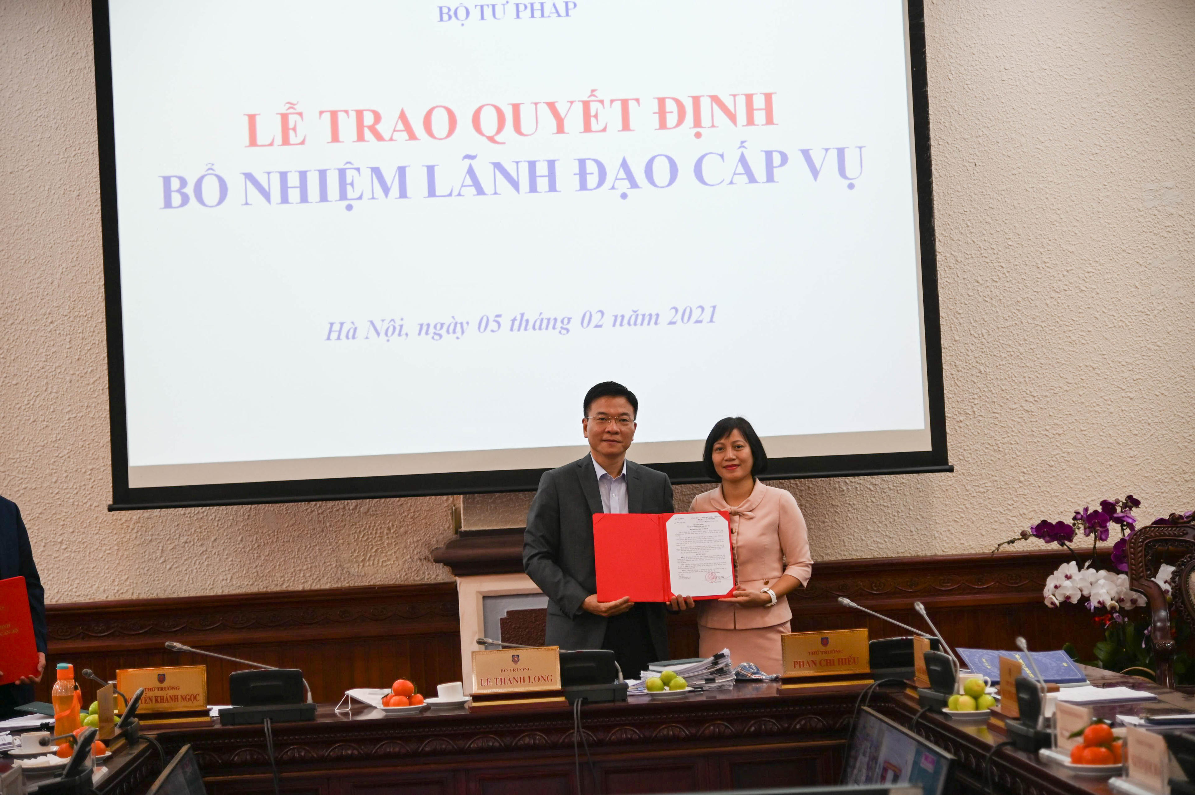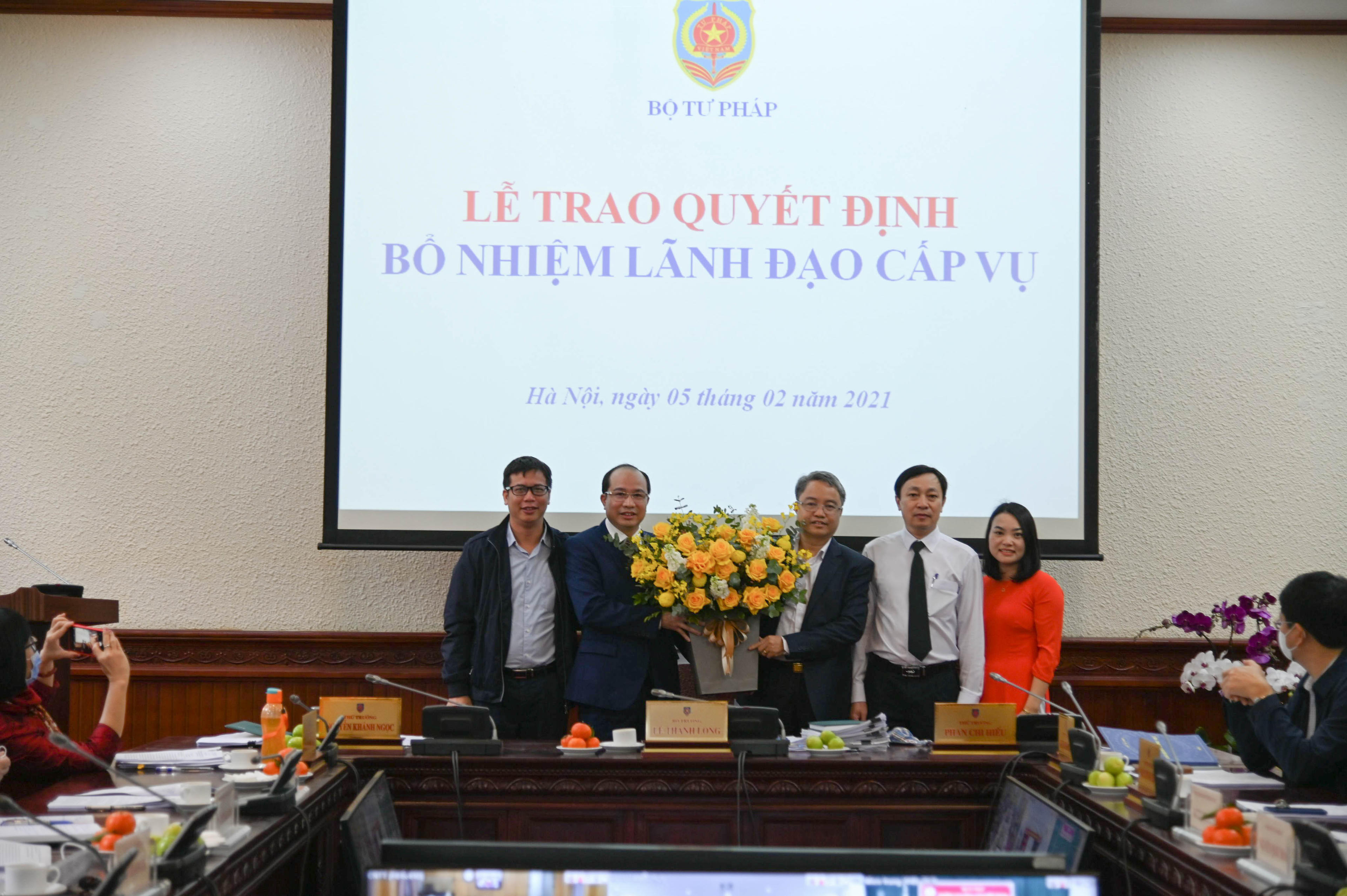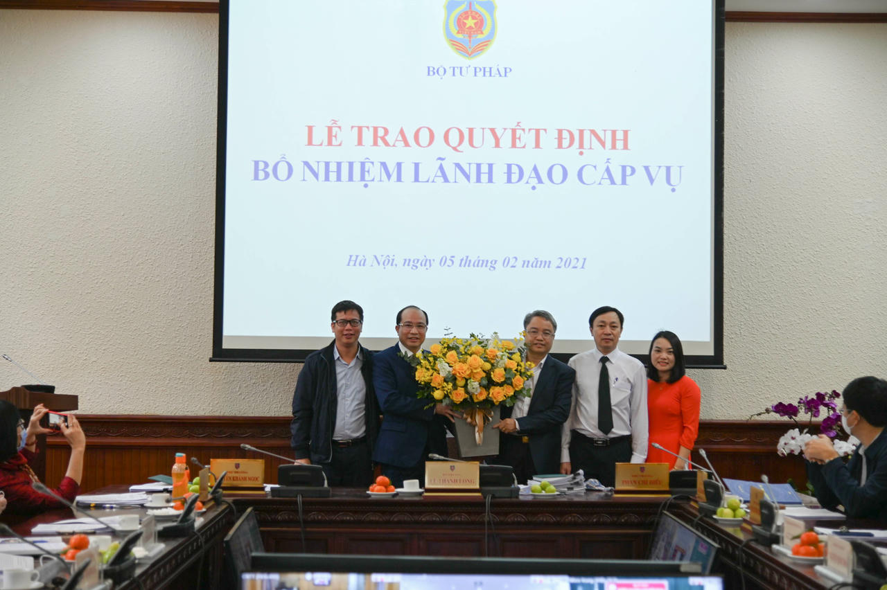 Khẳng định việc bổ nhiệm được thực hiện đúng quy trình, nghiêm túc, chặt chẽ, bảo đảm đầy đủ các điều kiện điều động, bổ nhiệm theo quy định của Đảng, Nhà nước, Bộ trưởng Lê Thành Long thay mặt Ban Cán sự Đảng, Lãnh đạo Bộ Tư pháp chúc mừng các đồng chí được bổ nhiệm lần này.