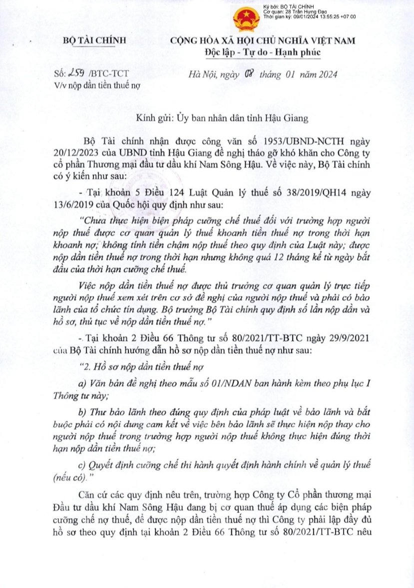 Cụ thể, Bộ Tài chính nhận được công văn số 1953/UBND-NCTH ngày 20/12/2023 của UBND tỉnh Hậu Giang đề nghị tháo gỡ khó khăn cho NSH Petro.