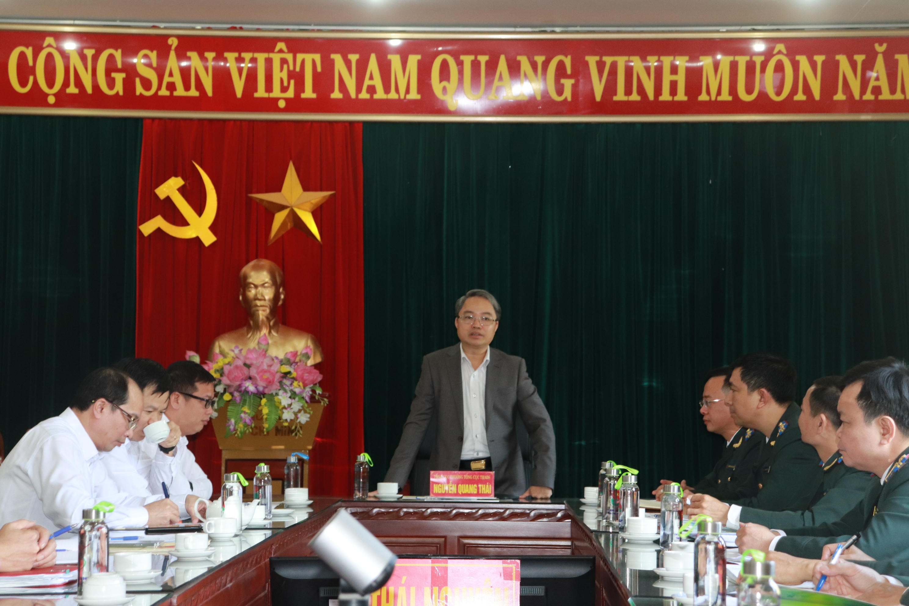 Chào xã giao Bí thư Tỉnh ủy Thái Nguyên Nguyễn Thanh Hải, Tổng cục trưởng Nguyễn Quang Thái đã chúc mừng thành công của Đại hội đại biểu Đảng bộ Tỉnh Thái Nguyên, chúc mừng Bí thư Nguyễn Thanh Hải trên cương vị mới đồng thời thông tin sơ bộ về tình hình công tác THADS trên phạm vi cả nước. Tổng cục trưởng cũng cám ơn sự quan tâm, lãnh đạo, chỉ đạo của Tỉnh ủy Thái Nguyên cũng như cá nhân Bí thư Tỉnh ủy Nguyễn Thanh Hải đối với công tác THADS trên địa bàn.