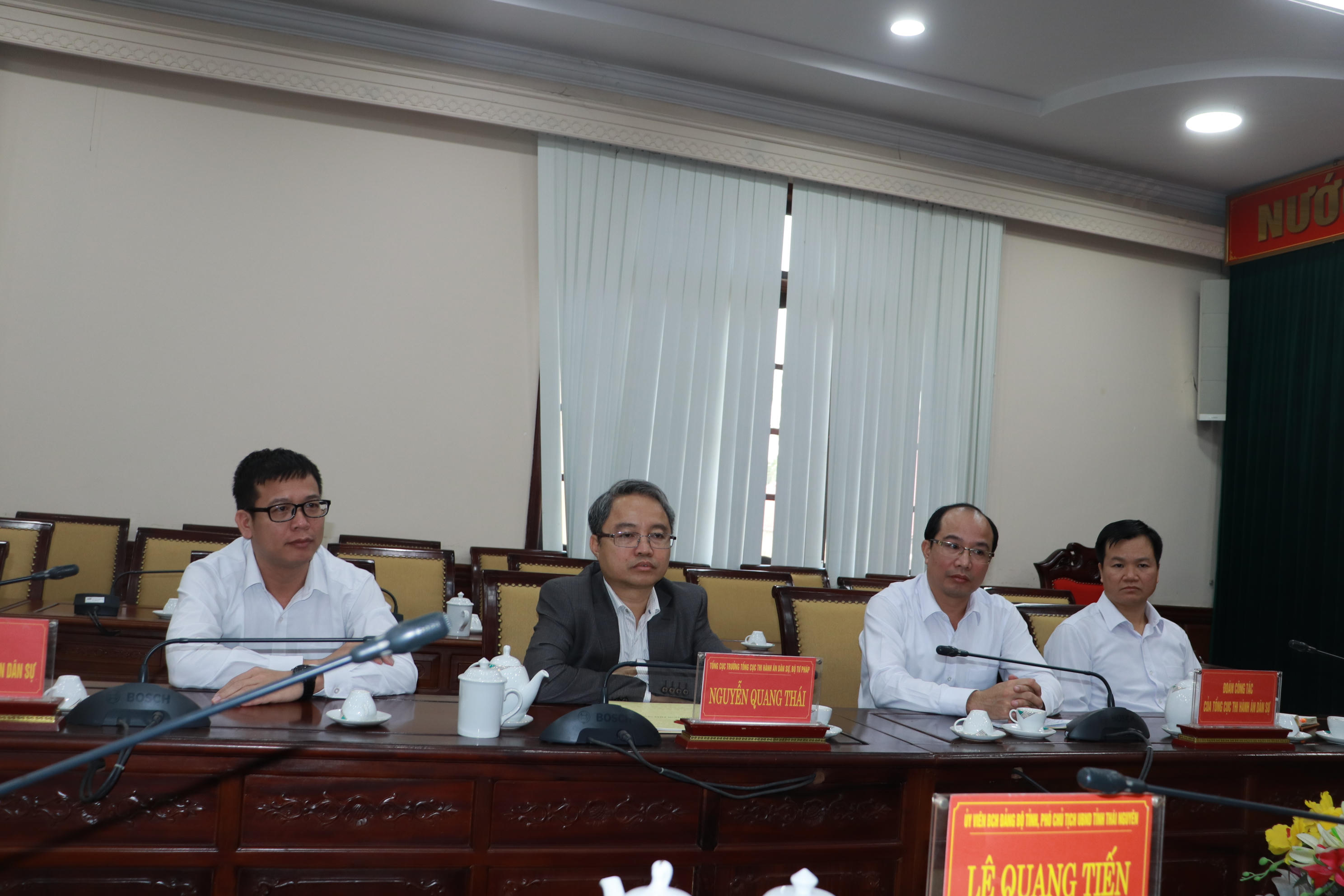 Tại buổi làm việc với Phó Chủ tịch UBND tỉnh Lê Quang Tiến, Trưởng Ban chỉ đạo THADS tỉnh, Tổng cục trưởng Nguyễn Quang Thái đã chúc mừng Thái Nguyên vừa tổ chức thành công Đại hội Đảng; cám ơn sự quan tâm của UBND tỉnh trong thời gian qua đối với công tác THADS và mong muốn thời gian tới tỉnh tiếp tục quan tâm, tạo điều kiện cho THADS hoàn thành tốt nhiệm vụ, đặc biệt trong việc giải quyết các vụ án giá trị lớn, khó khăn phức tạp trên địa bàn.