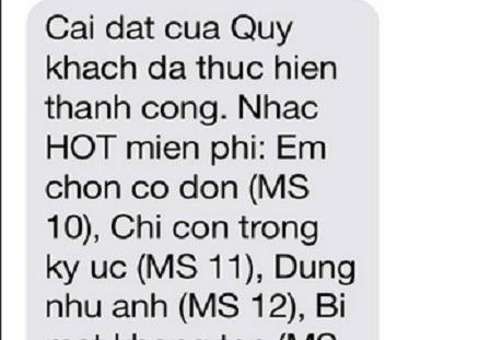 “Cài đặt của quý khách đã thực hiện thành công. Nhạc HOT miễn phí: Em chọn cô đơn (MS 10), Chỉ còn trong ký ức (MS 11), Đừng như anh (MS 12), Bí mật không tên (MS 13). Để tải, soạn CHỌN <MS> gửi 9224 (Ví dụ: CHỌN 10)”.