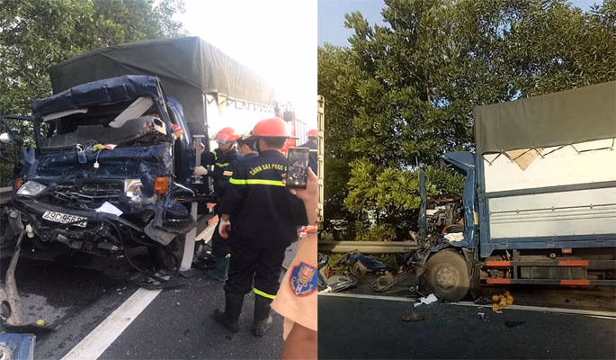 Cú tông mạnh khiến chiếc xe tải bị dính vào phần đuôi xe container, tài xế lái xe tải thiệt mạng tại chỗ.