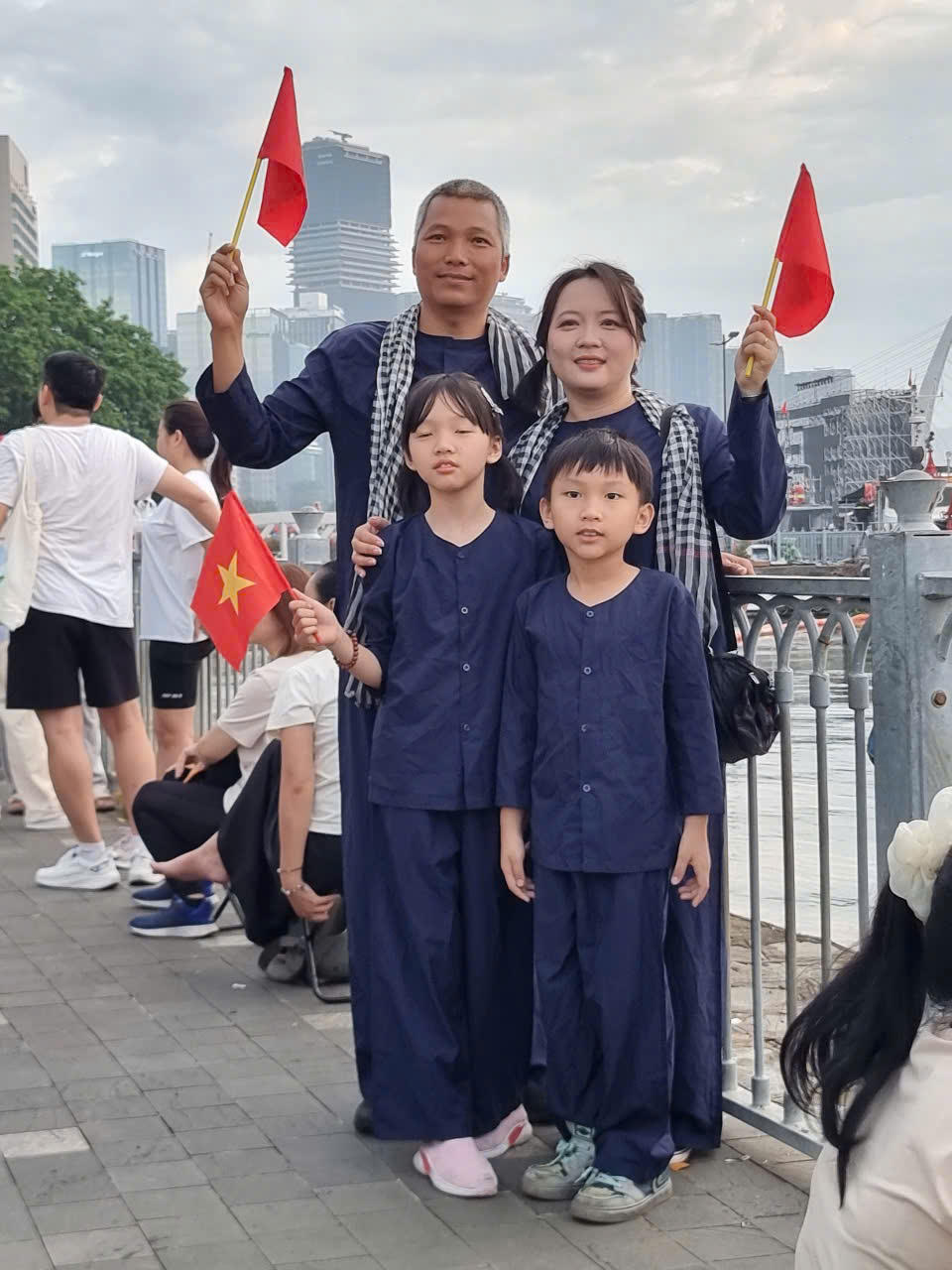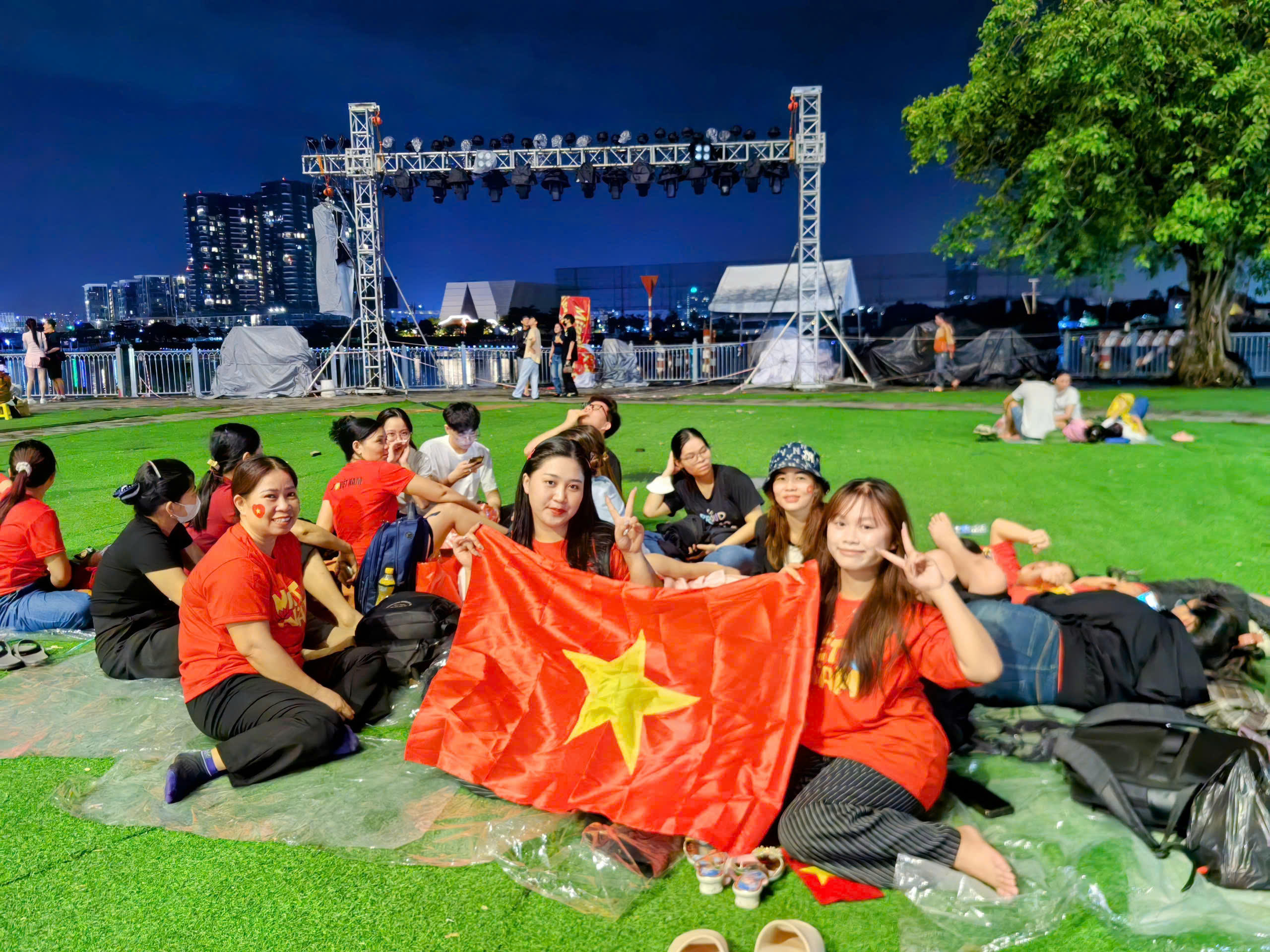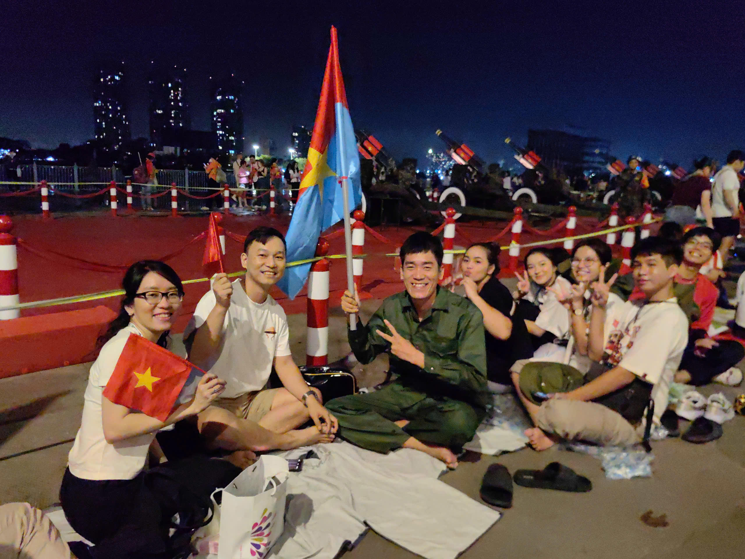Chị Ngọc Ánh (người cầm cờ bên phải, Hải Phòng) chia sẻ, nhân dịp vào chơi với họ hàng tại phường Long Bình, Biên Hòa, Đồng Nai, chị cùng bà con trong khu phố trải nghiệm tuyến Metro và nghỉ lại qua đêm tại Bến Bạch Đằng để hôm nay, 27/4, kịp xem tổng duyệt diễu binh.