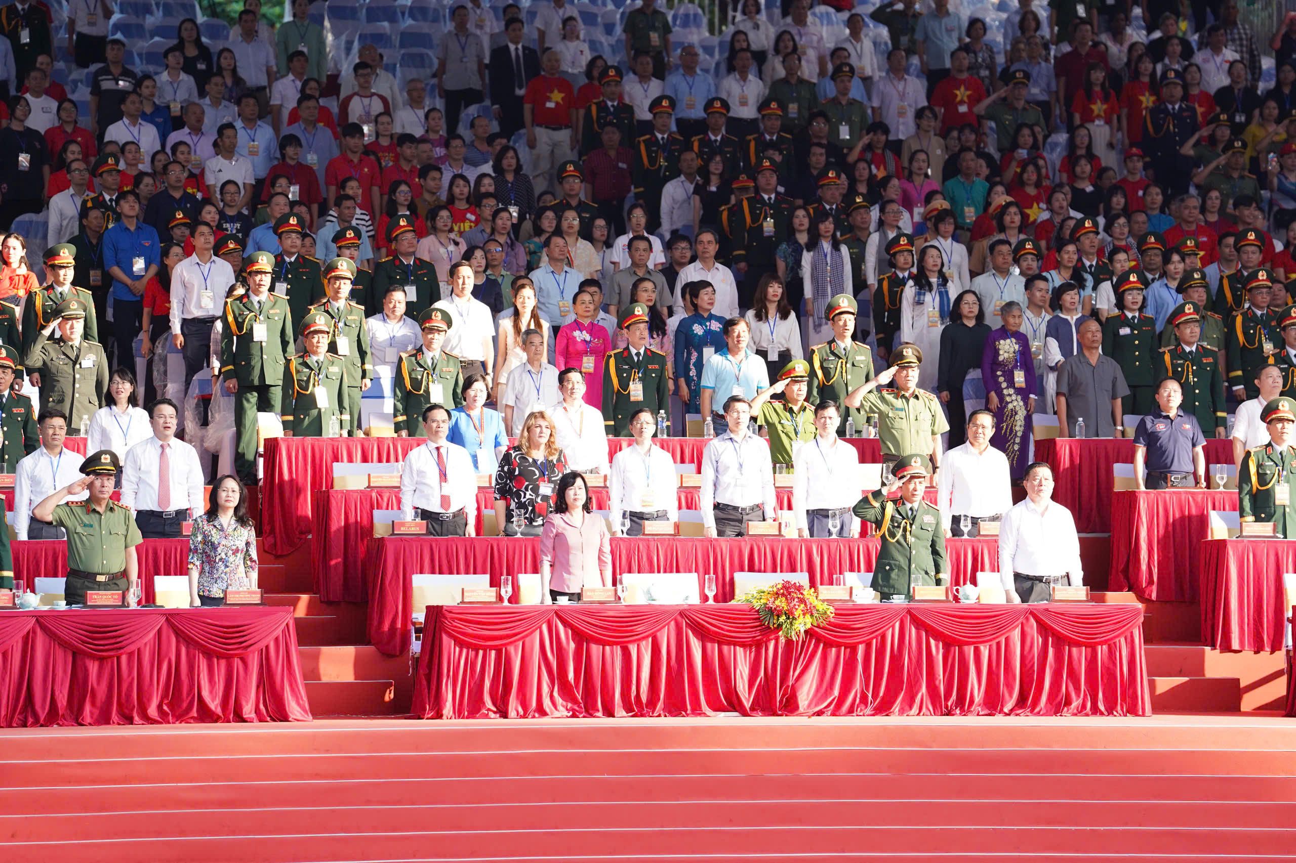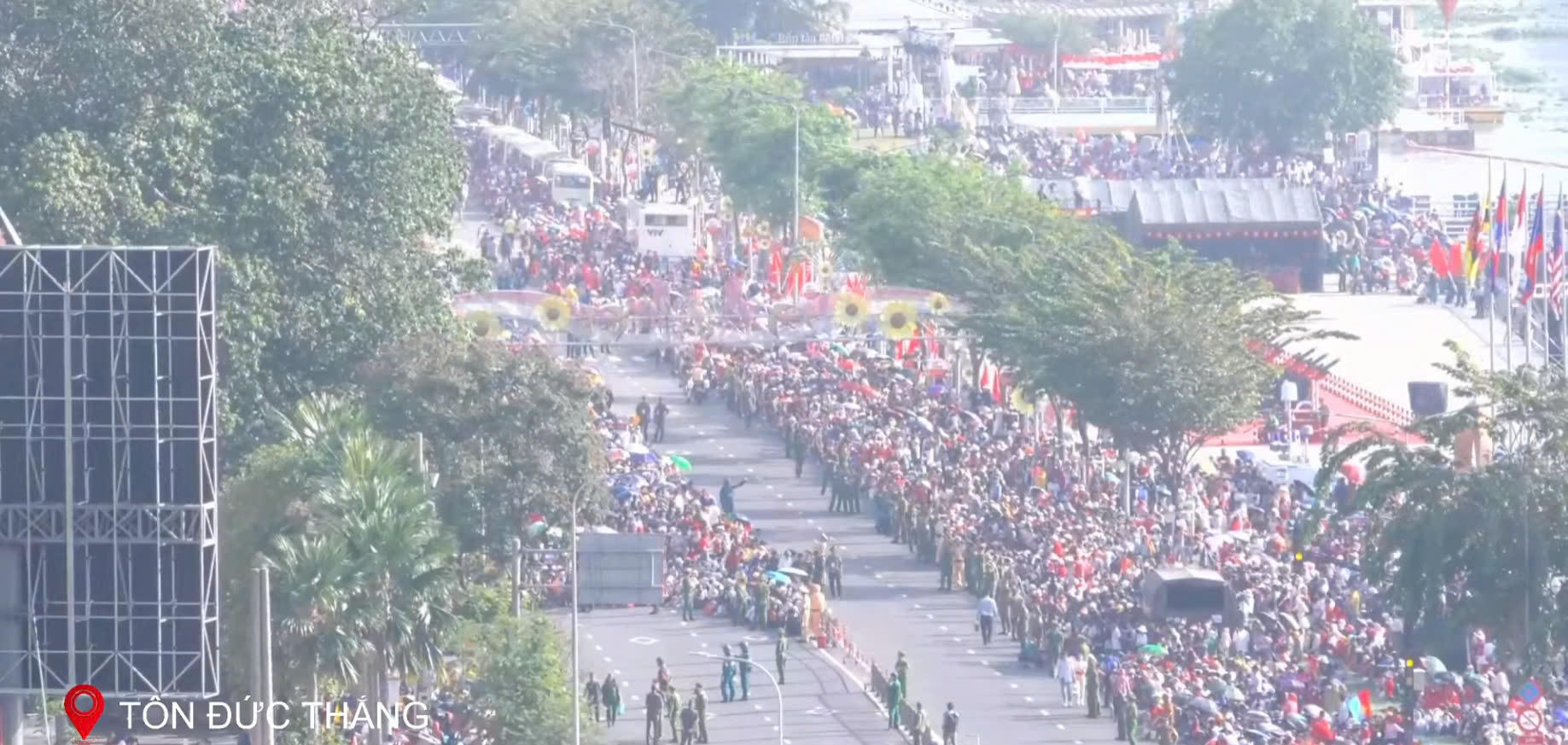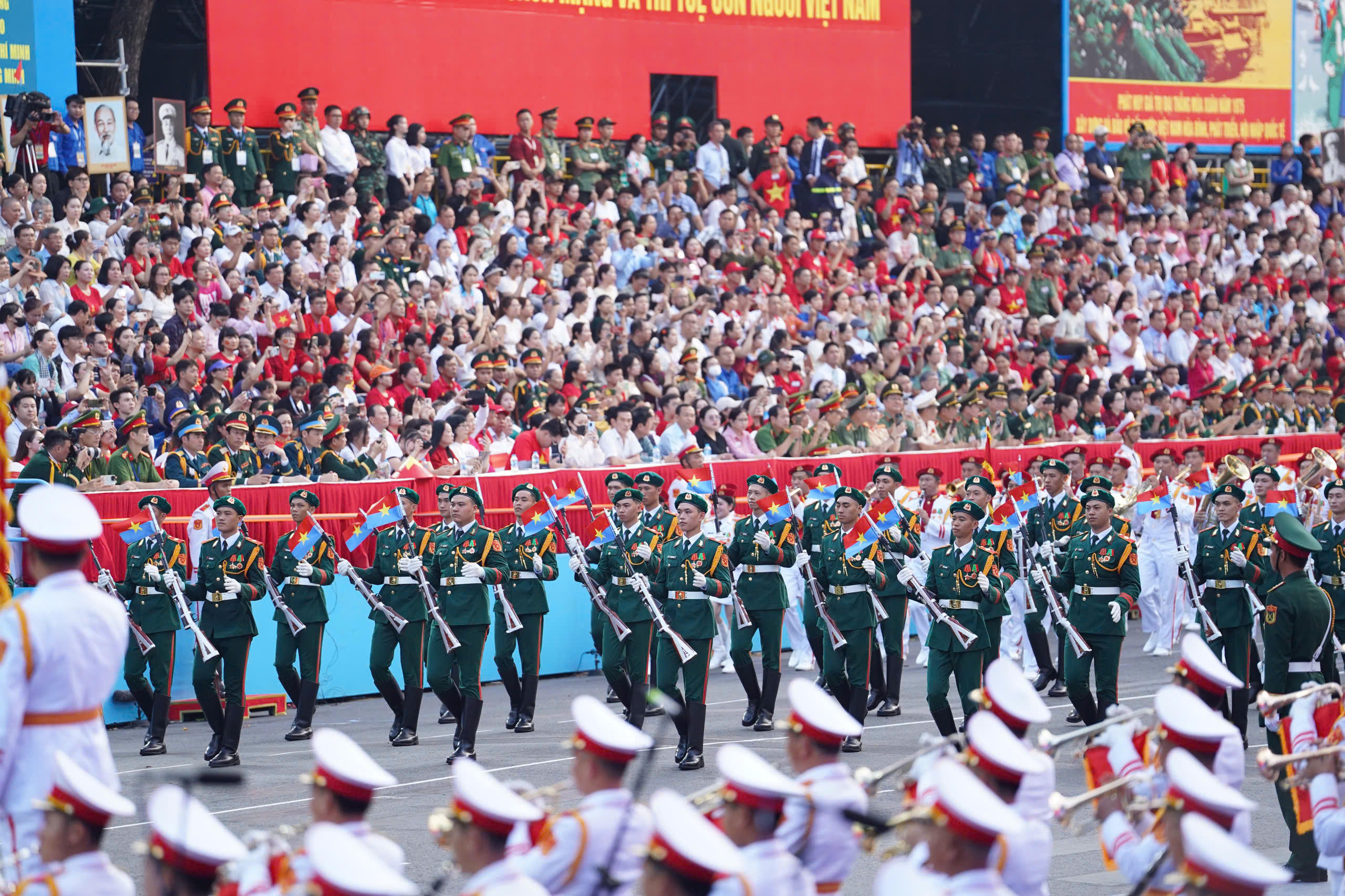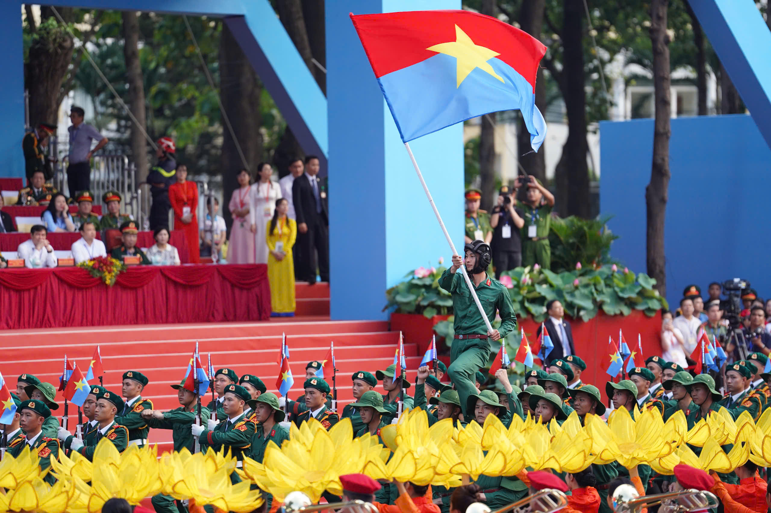 Trước đó, từ 7h, các đoàn, các khối quân đội, công an, địa phương... hùng dũng, trang nghiêm tiến tới khu vực lễ đài chính. Các đoàn, các khối bước lặng lẽ nhưng đi tới đâu sóng reo hò "Việt Nam!", "Việt Nam - Hồ Chí Minh", "Tuyệt vời"... của đông đảo của người dân vang lên tới đó.