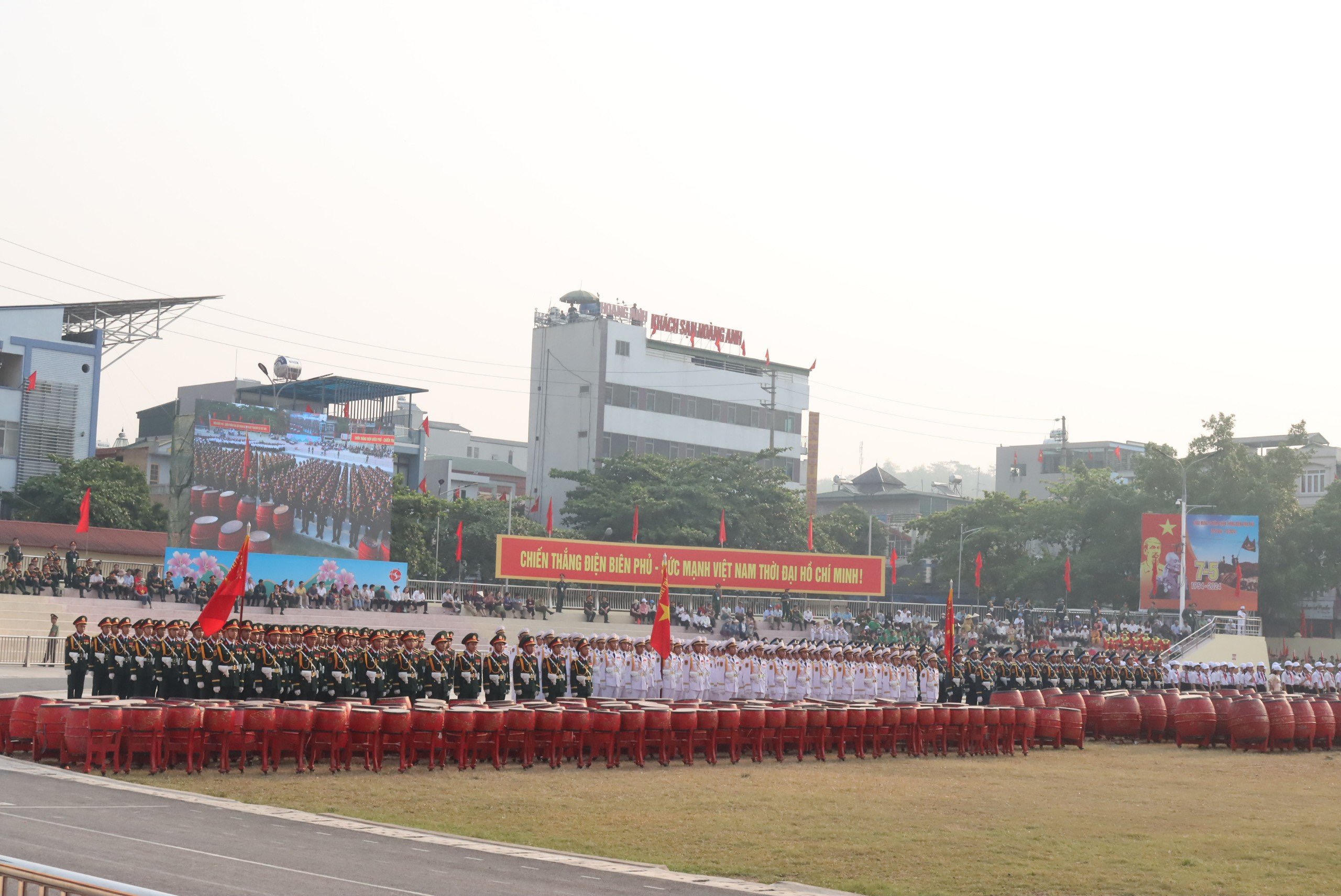 Lực lượng của tỉnh Điện Biên có 3 khối nghi trượng, khối nữ dân quân các dân tộc Tây Bắc, các khối diễu hành quần chúng và 20 khối đứng làm nền trên sân.