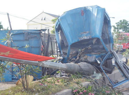 Tại hiện trường cabin bị biến dạng nặng do đâm trực diện vào cột đèn, phần thùng xe bị rơi ra khỏi thân xe nằm chắn một phần đường, cột đèn cao áp bị xe tông gãy đổ.