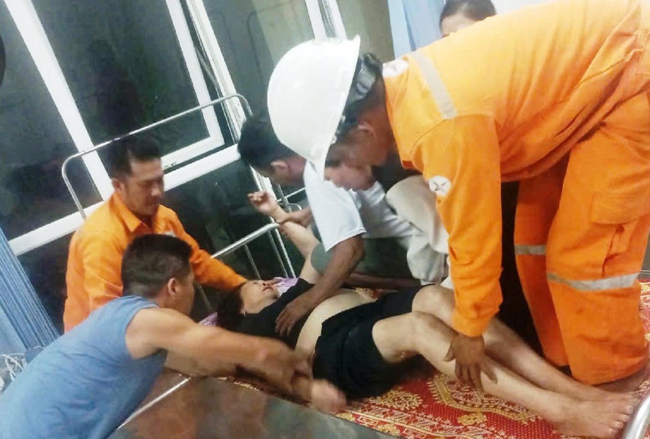 Công nhân điện lực Bố Trạch tiến hành sơ cứu người dân bị điện giậtngừng thở. |