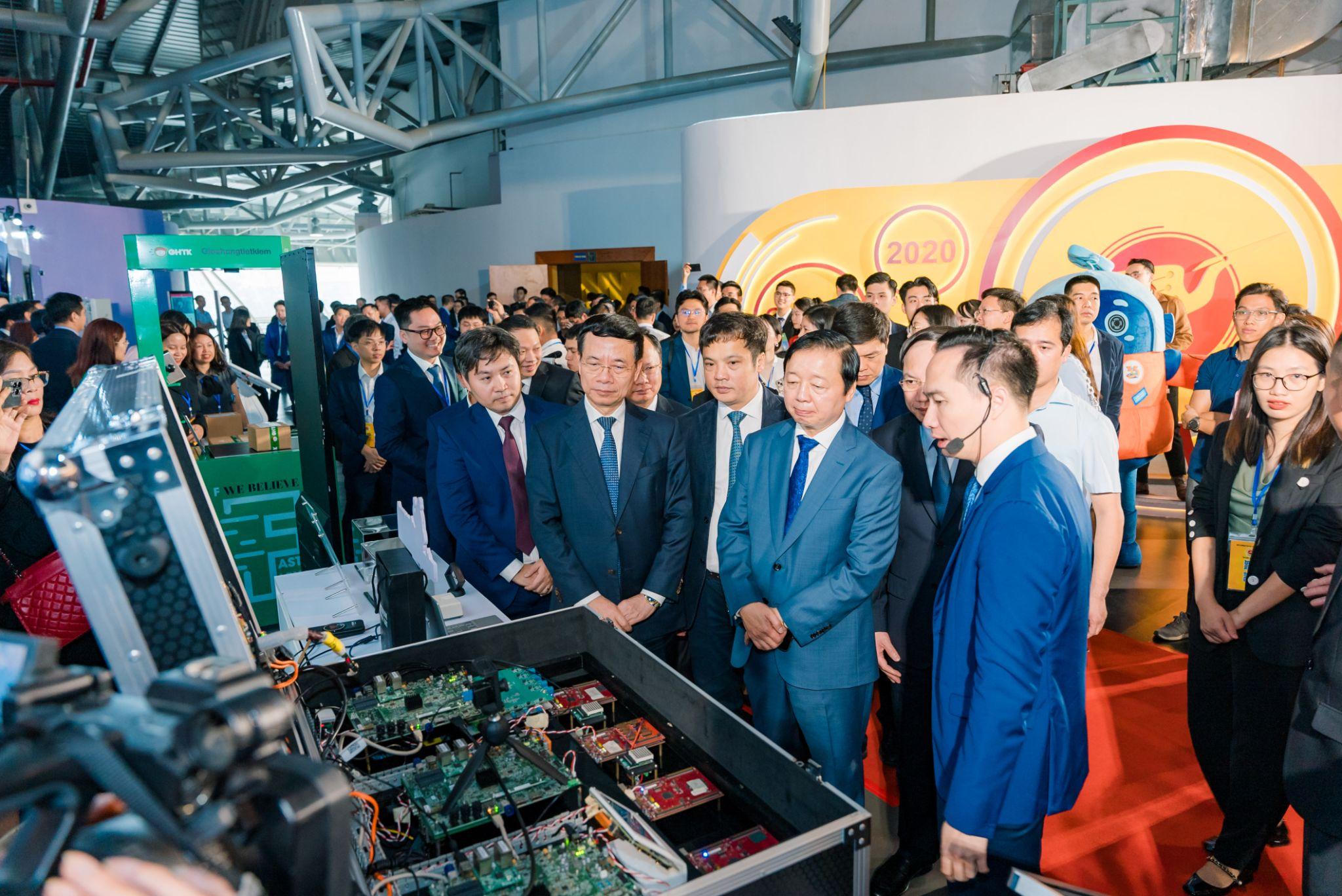 Phó Thủ tướng Trần Hồng Hà, Bộ trưởng Thông tin và Truyền thông Nguyễn Mạnh Hùng, Lãnh đạo Bộ TT&TT cùng Lãnh đạo tỉnh Quảng Ninh, Lãnh đạo các tổ chức, doanh nghiệp tham quan gian hàng FPT. |
