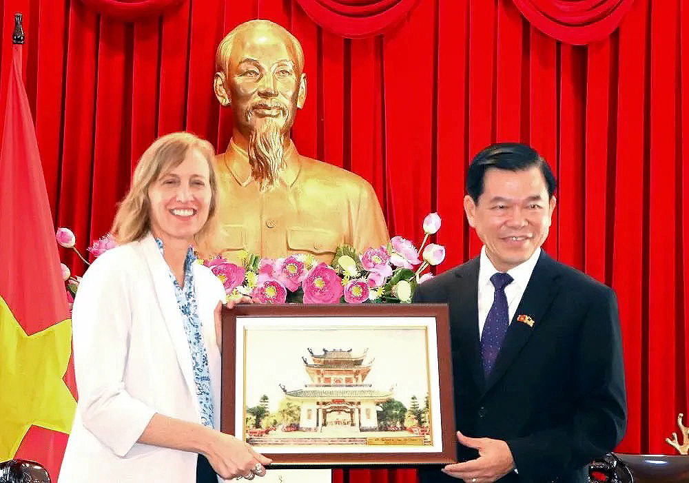 Bí thư Tỉnh uỷ Nguyễn Hồng Lĩnh tặng quà lưu niệm cho Tổng Lãnh sự quán Hoa Kỳ Susan Burns |
