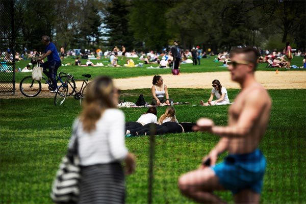 | Người dân đổ xô đến công viên trung tâm ở New York, Mỹ để tận hưởng ngày nắng đẹp hôm 2/5. Ảnh: Reuters |