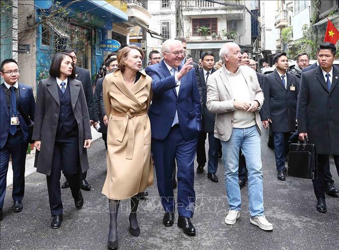 | Tổng thống Cộng hòa Liên bang Đức Frank-Walter Steinmeier và Phu nhân đi dạo qua những con phố nhỏ tại phường Văn Miếu, quận Đống Đa. Ảnh: Phạm Kiên/TTXVN |