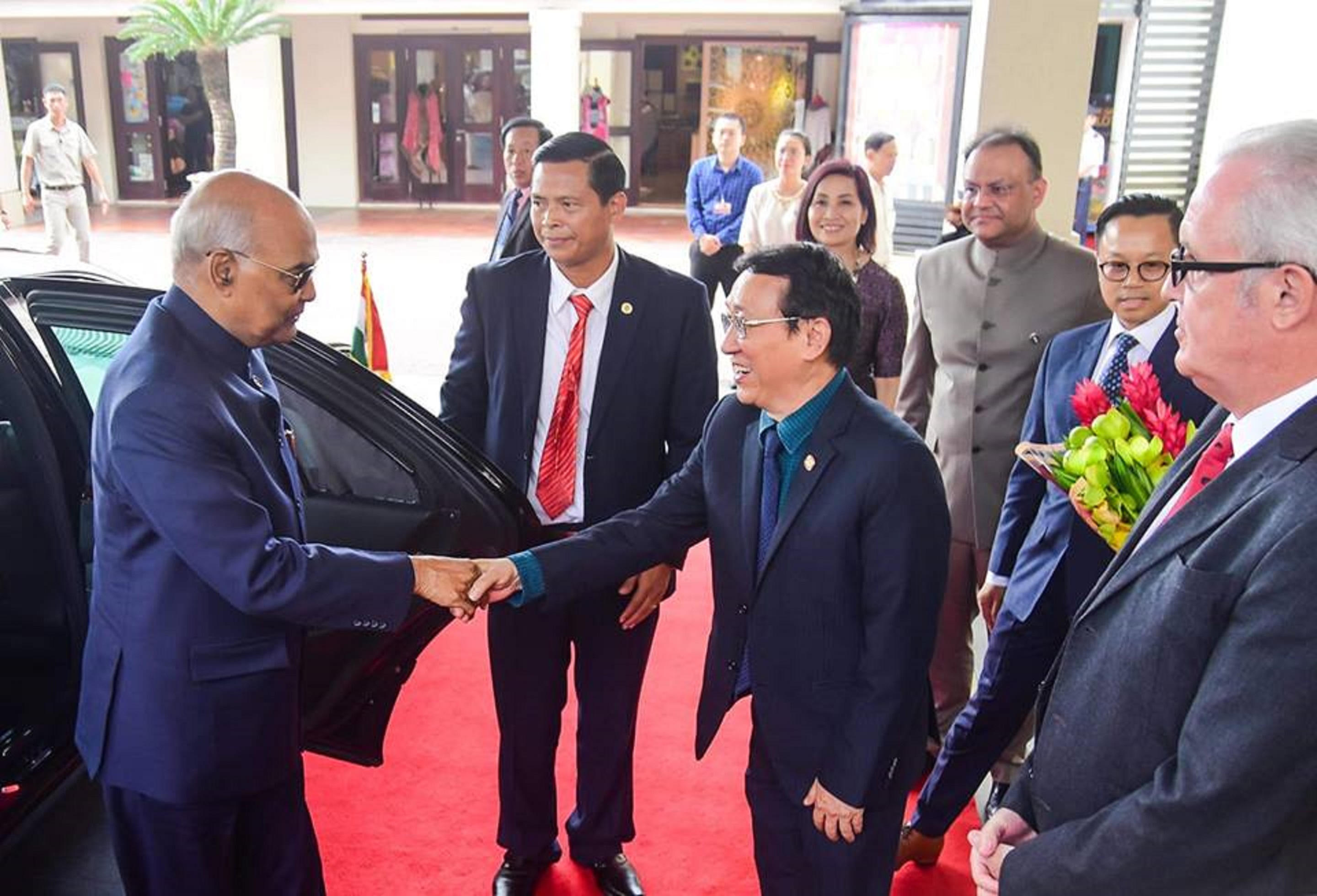Đón Tổng thống Ấn Độ và phu nhân tại sân bay quốc tế Đà Nẵng có ông Đào Việt Trung, Chủ nhiệm Văn phòng Chủ tịch nước; ông Phạm Sanh Châu, Đại sứ Việt Nam tại Ấn Độ; ông Huỳnh Đức Thơ, Chủ tịch UBND TP.Đà Nẵng cùng nhiều lãnh đạo Văn phòng Chủ tịch nước và Bộ Ngoại giao.