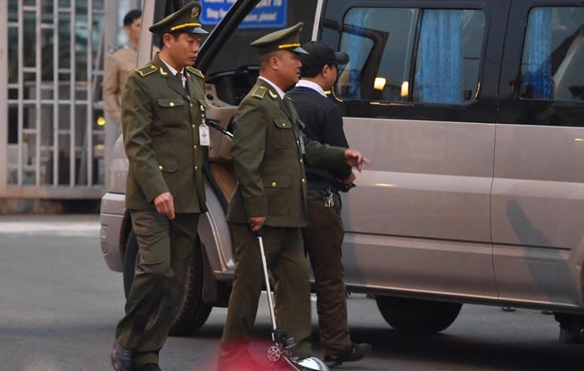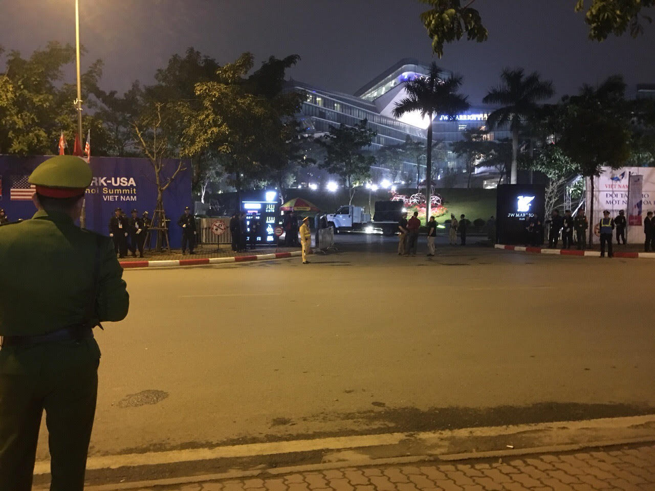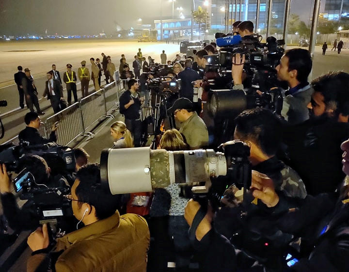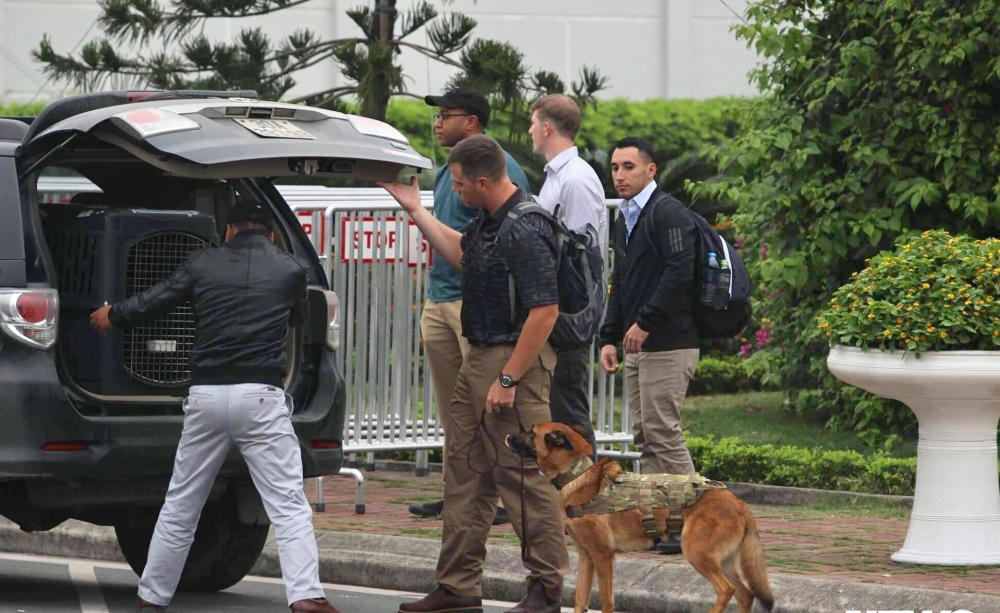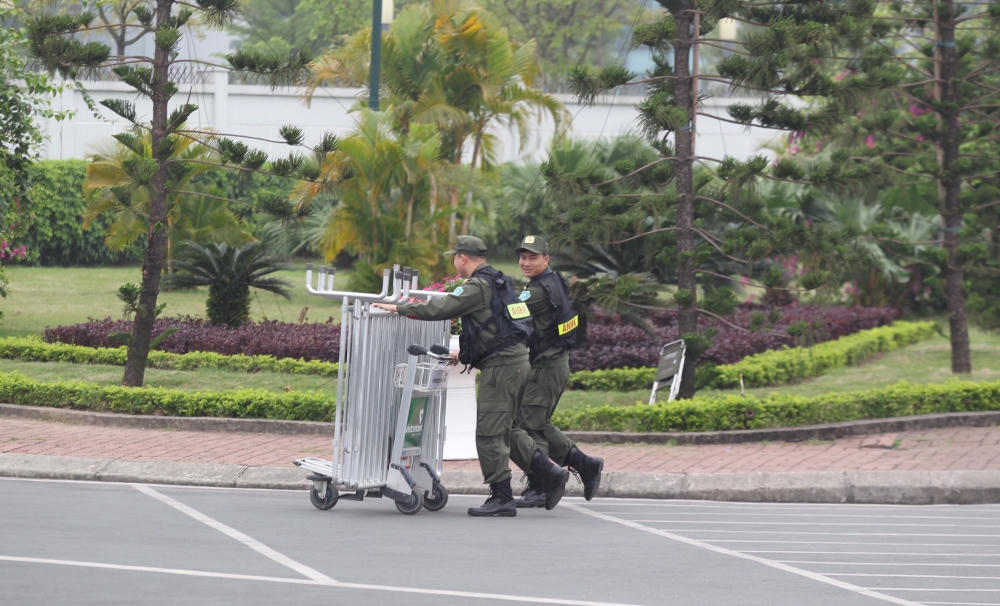 Vài giờ đồng hồ trước khi Tổng thống Mỹ Donald Trump tới Hà Nội, một hàng rào an ninh được thiết lập trước cổng ra vào sảnh VIP A sân bay Nội Bài, công tác kiểm tra và rà mìn cũng được tiến hành tỉ mỉ.