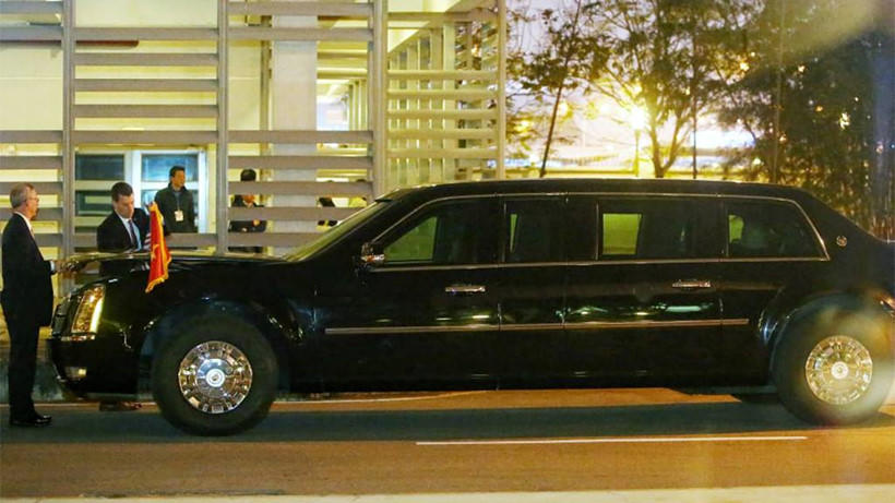 Trước đó, vào lúc 18h10 tối nay (26/2), hai chiếc “Quái thú” đã xuất phát từ khách sạn Marriot hướng về sân bay Nội Bài chuẩn bị đón Tổng thống Trump.