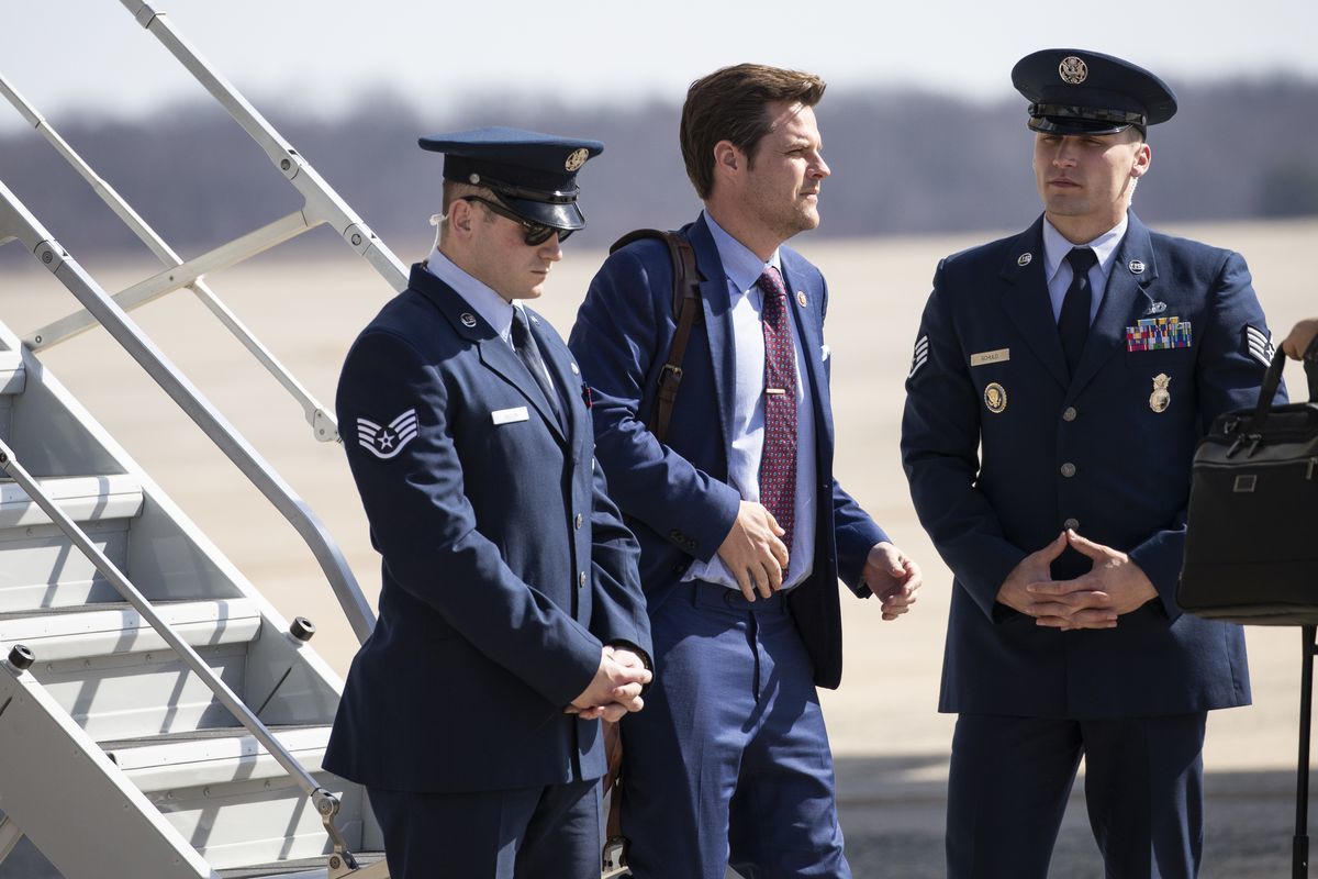 | Nghị sĩMatt Gaetz xuống khỏi phi cơ Không lực Một ở Căn cứ Không quân Andrews hôm 9/3 |