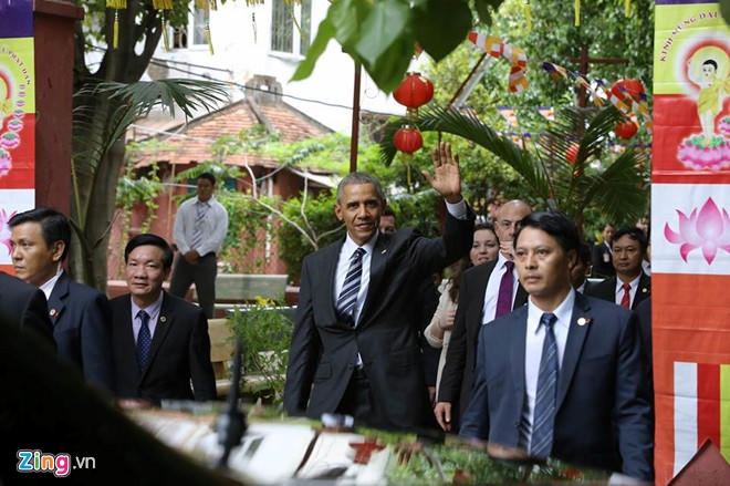 Ông Obama cúi đầu chào nhà sư chùa Ngọc Hoàng (Ảnh: Viễn Sự/TTO) |