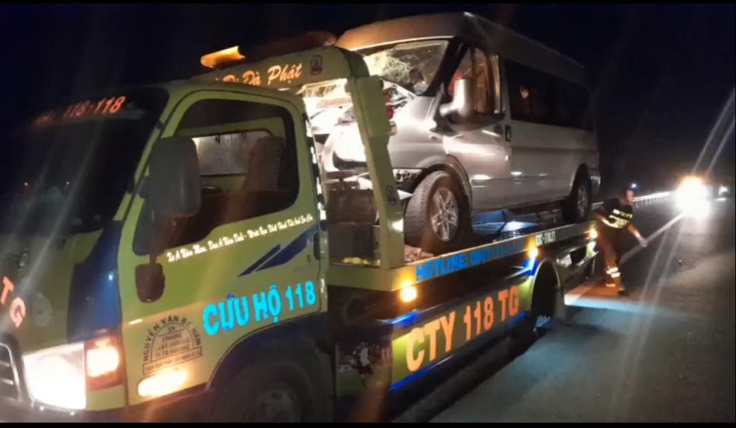 Ít phút sau xe khách loại 16 chỗ BKS 94B-004.22 điều khiển lưu thông cùng chiều từ phía sau trờ tới bất ngờ tông vào đuôi rơ moóc. Cú va chạm mạnh phần đầu xe khách dính chặt vào phần đuôi xe đầu kéo làm xe hư hỏng nặng. Xe khách bị bung túi khí, tài xế may mắn thoát chết trong gang tấc.