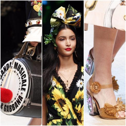 Giày kiểu sandals mô phỏng như thật những sợi mì spaghetti, kết hợp cùng phụ kiện cài tóc độc đáo. Tư duy châm biếm lại được thể hiện qua các mẫu túi xách mô phỏng hình ảnh đàn violin, trống, hay khăn trải bàn kẻ ca-rô đặc trưng dùng trong những nhà hàng pizza tại Ý.